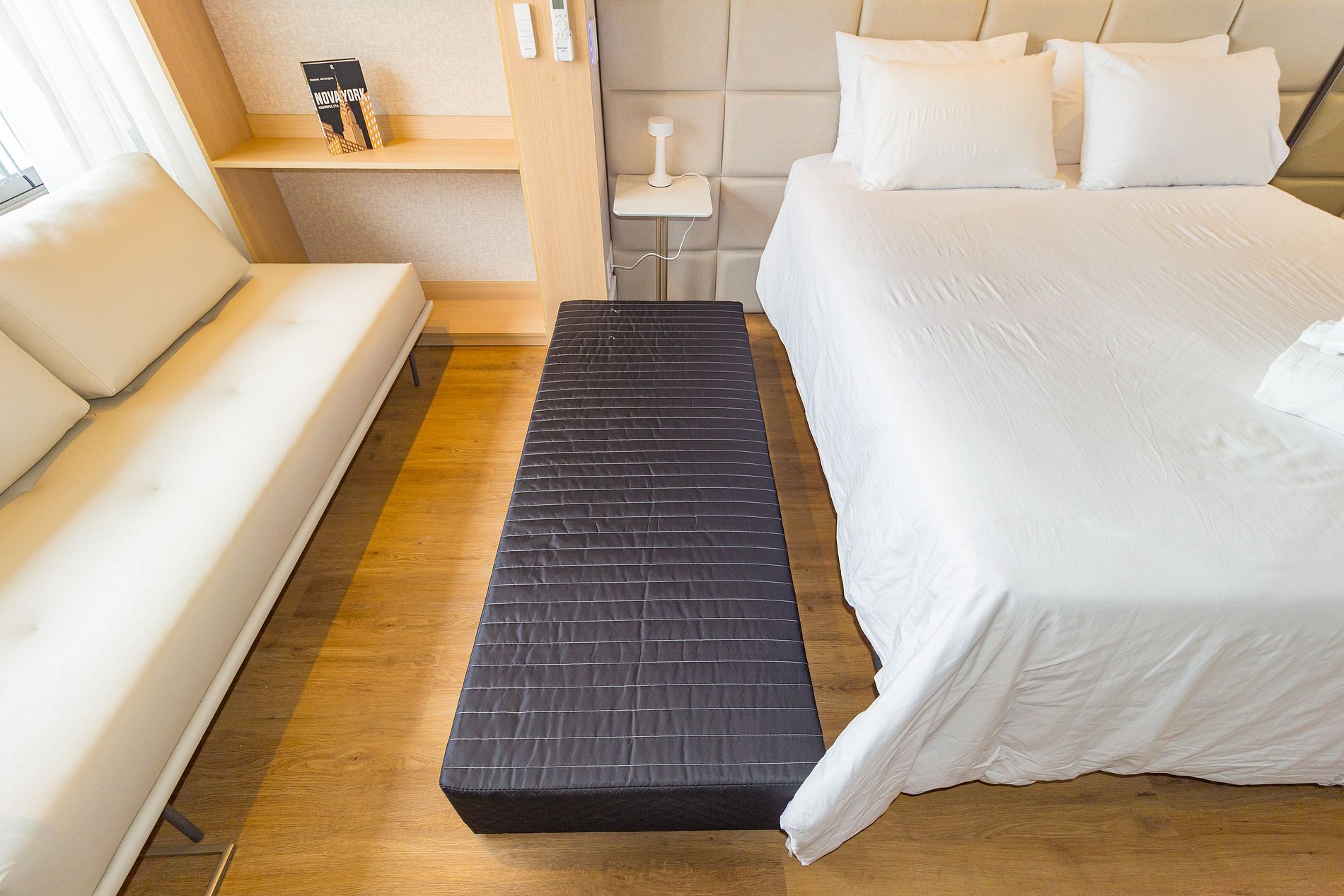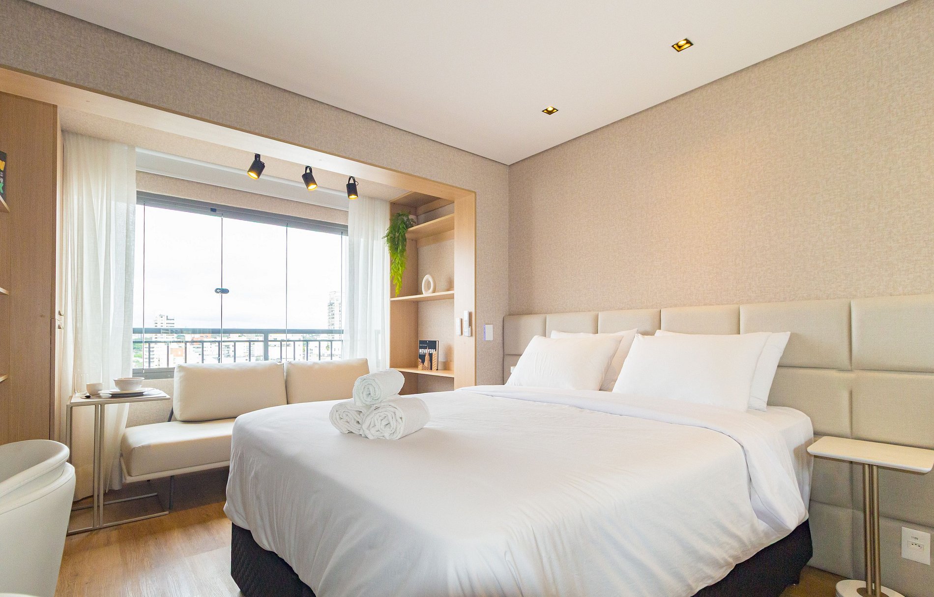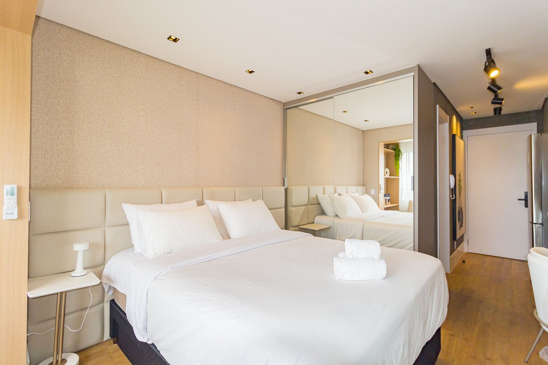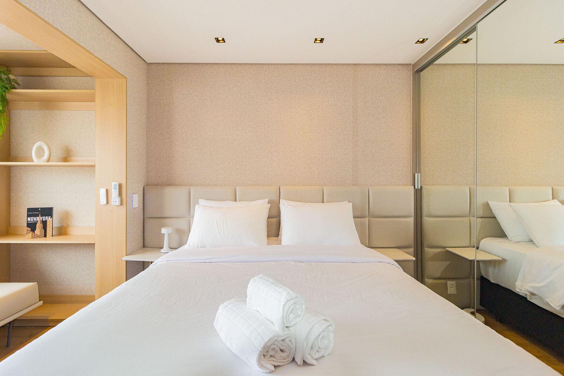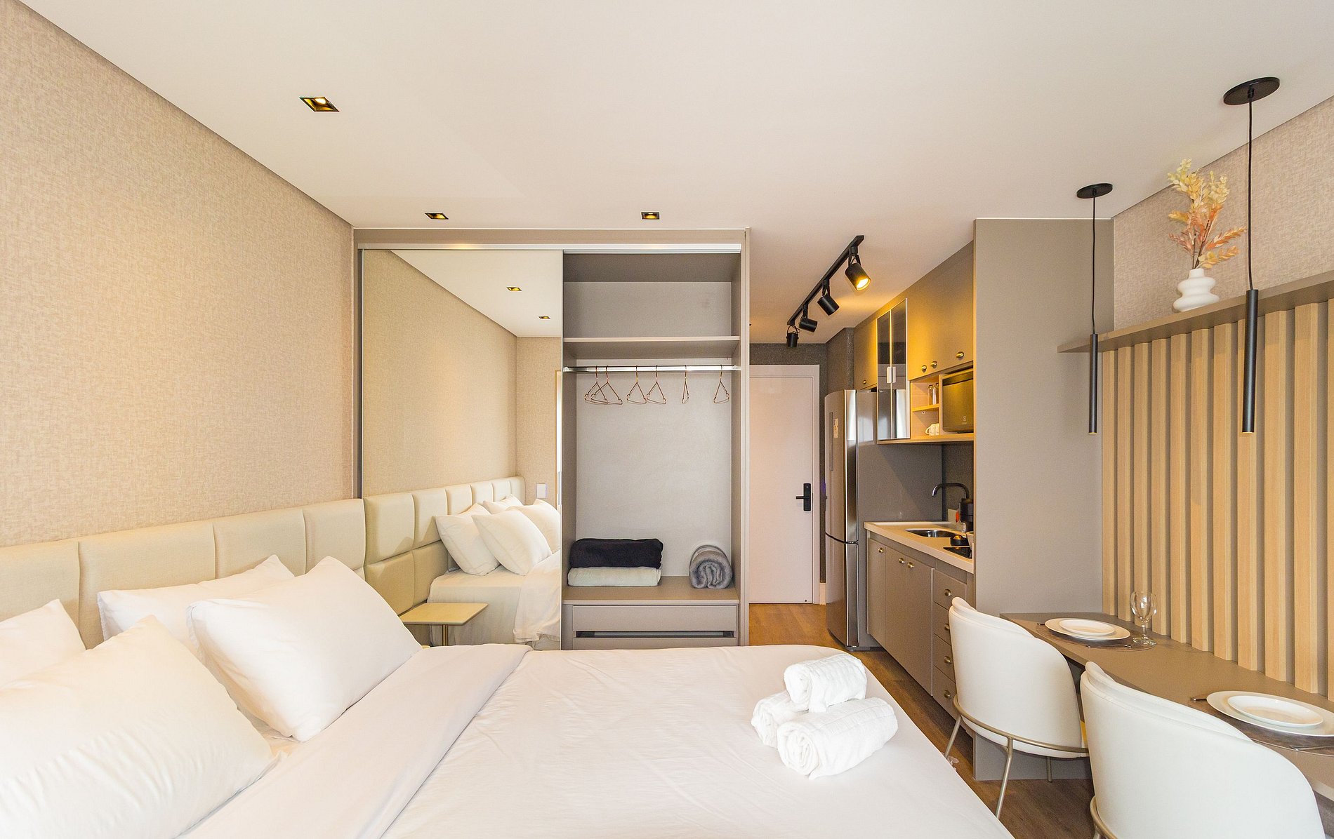▷ Studio: cama queen size, sofá cama solteiro, colchão solteiro, enxoval padrão hotel, Wifi 500Mbps, Tv Smart, ar condicionado split, mesa para refeições e trabalho, ferro de passar ou vaporizador e fechadura eletrônica.
