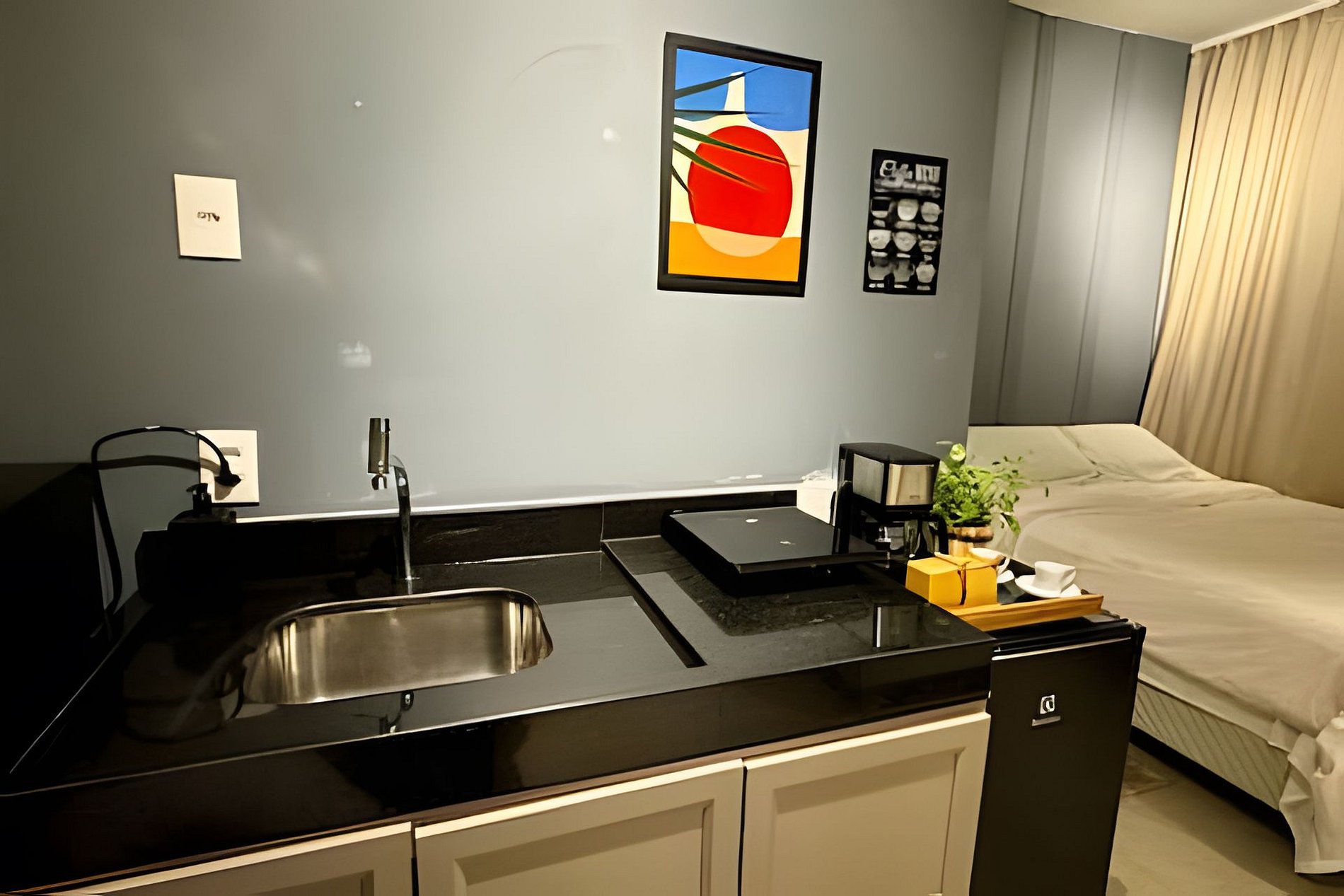 ᐅ Studio: cama queen size, roupas de cama, cortina blackout, Wifi 500Mbps, Tv Smart com canais de antena digital, ar condicionado split, ferro de passar e fechadura eletrônica.
