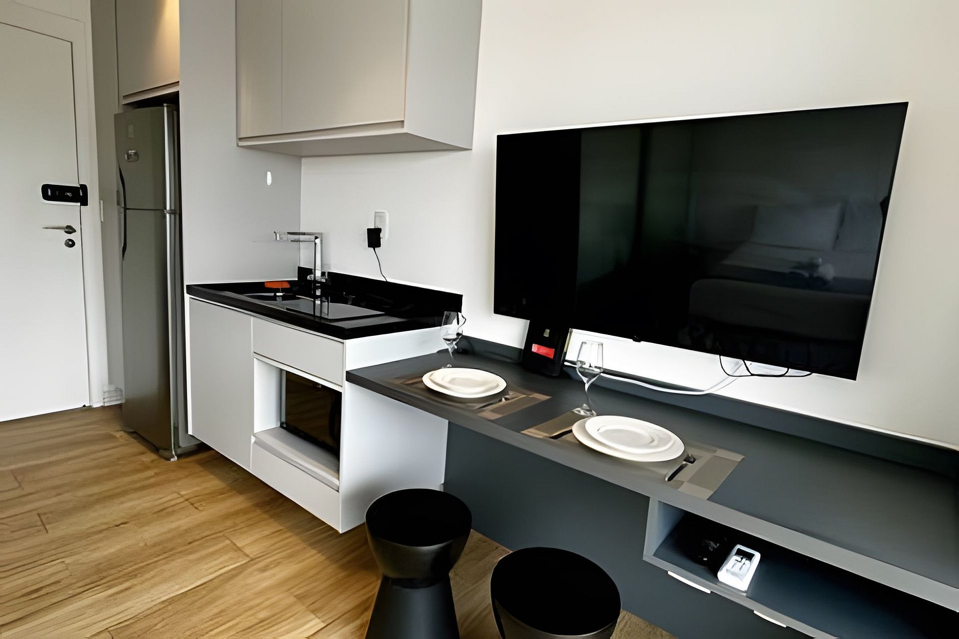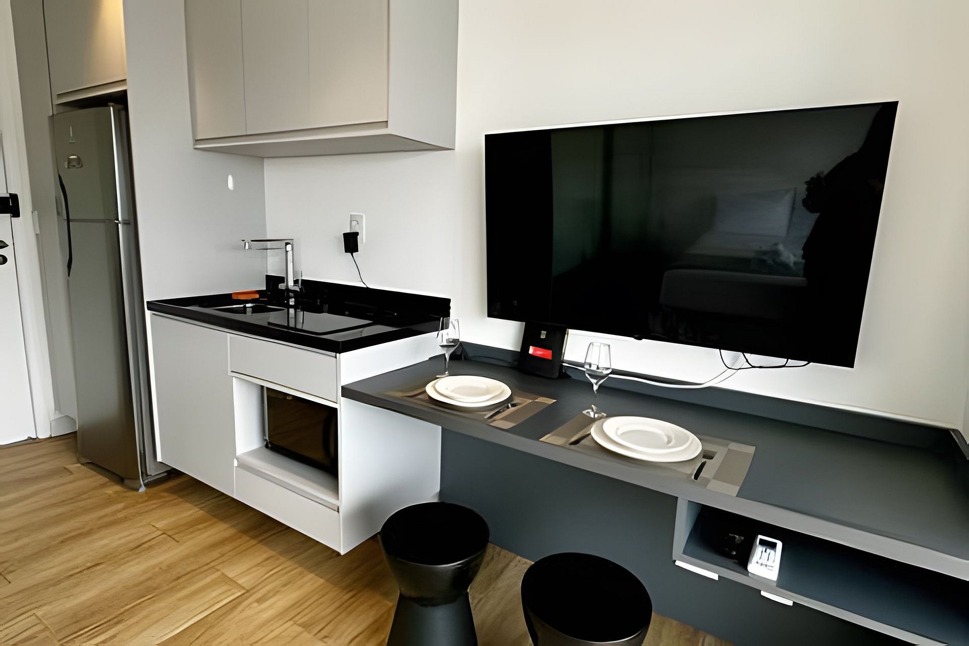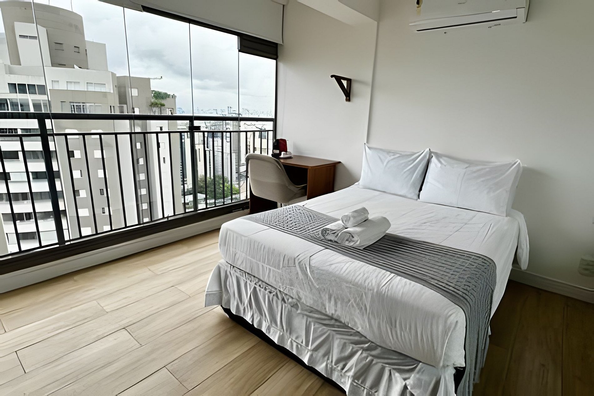 ▷ Studio: cama de casal, roupas de cama, Wifi 500Mbps, Tv Smart, ar condicionado split, ferro de passar ou vaporizador e fechadura eletrônica.