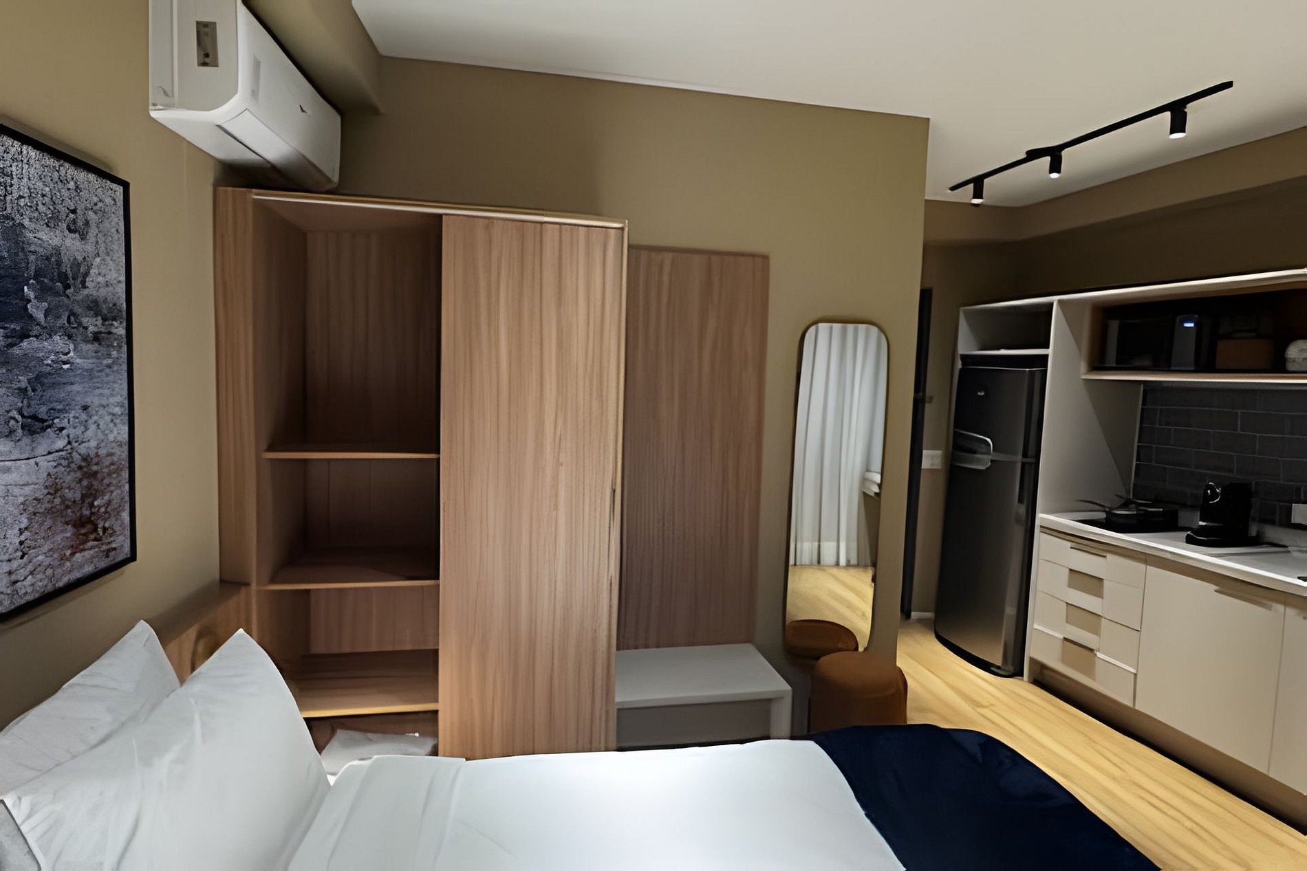 ᐅ Studio: cama queen size, roupas de cama, cortina blackout, Wifi 500Mbps, Tv Smart com canais de antena digital, ar condicionado split, fechadura eletrônica.