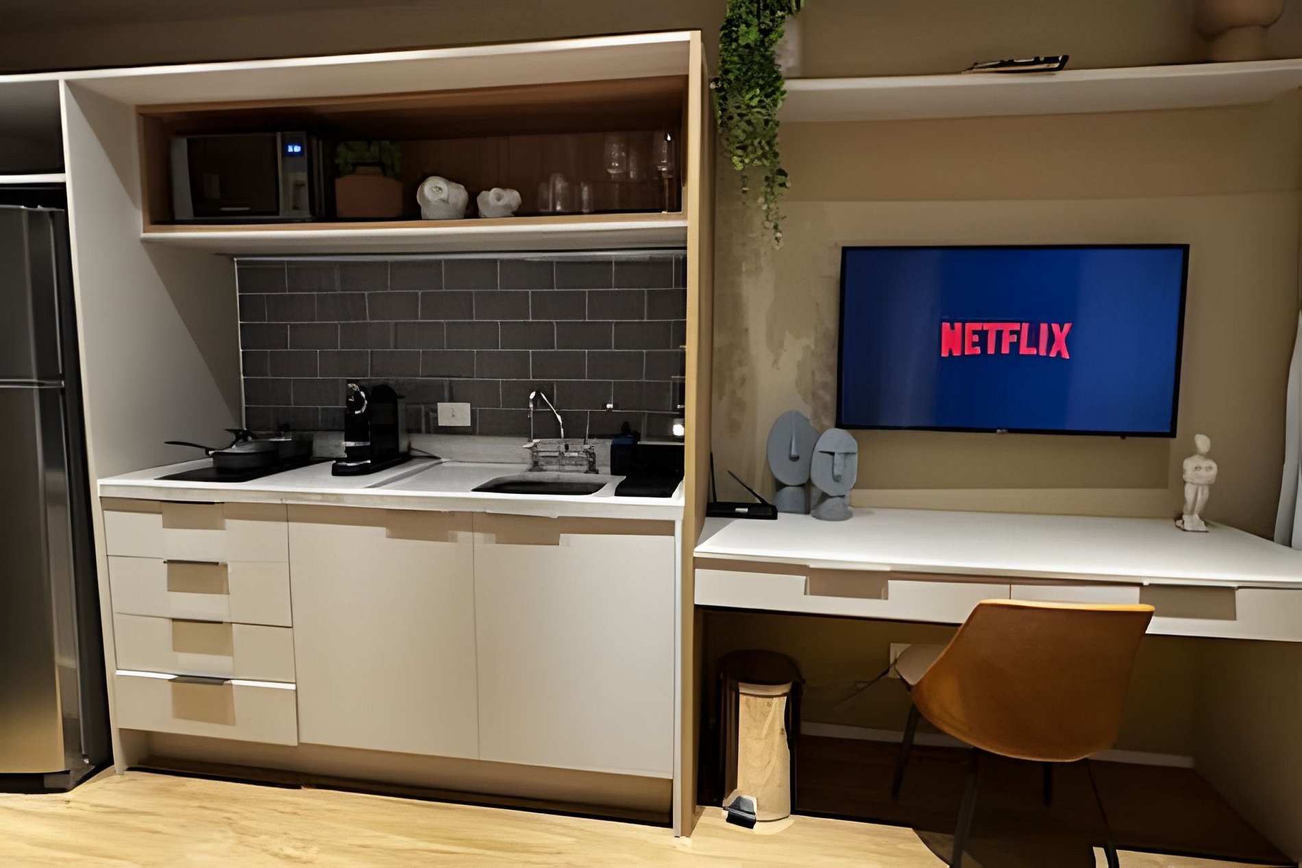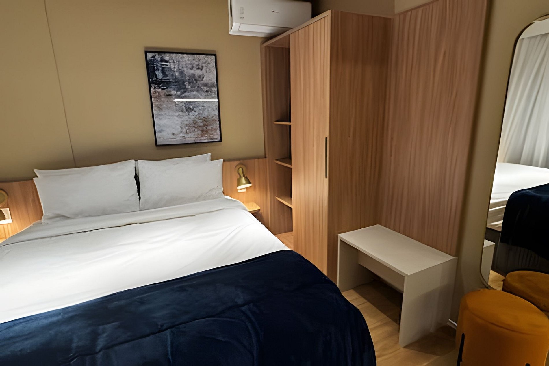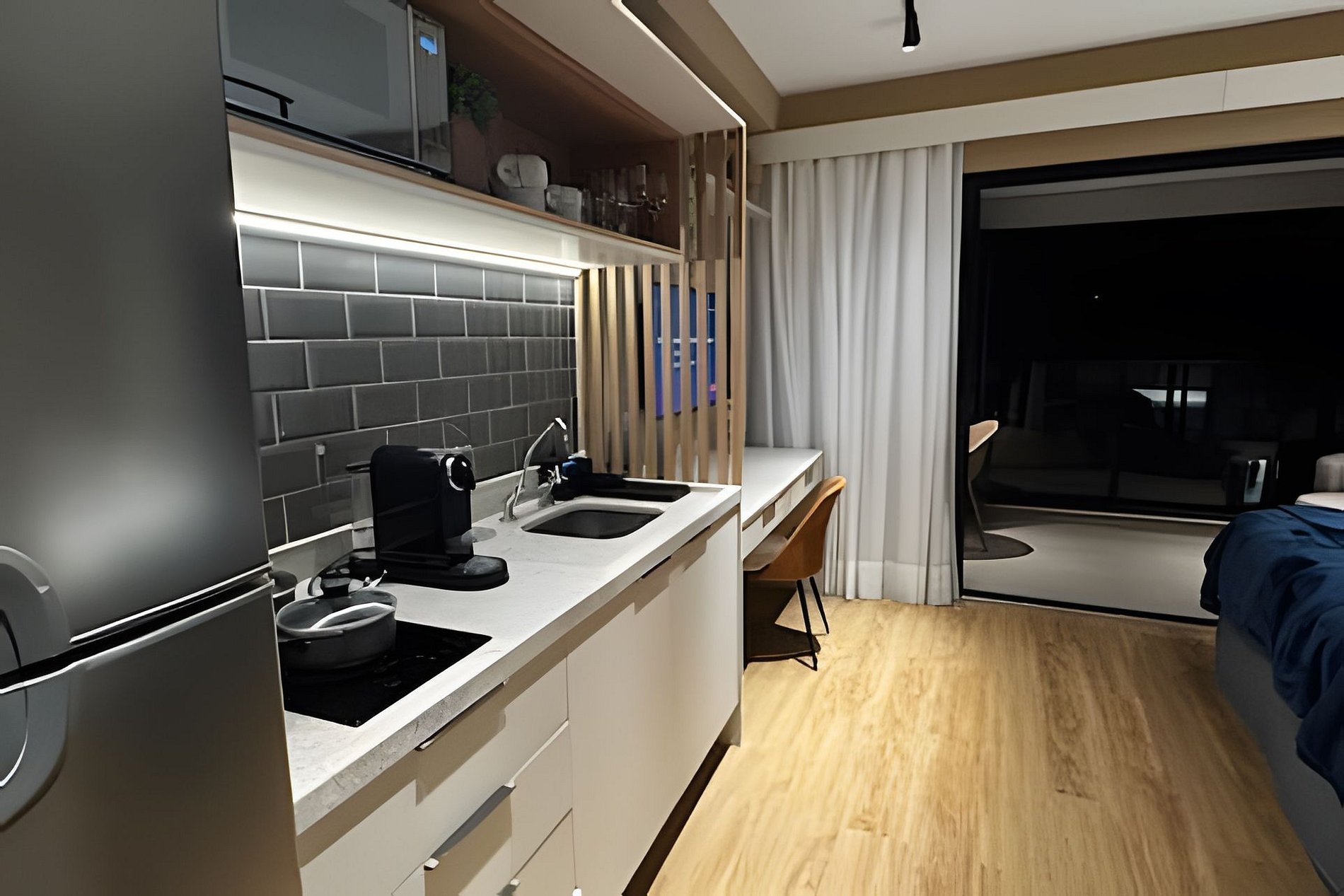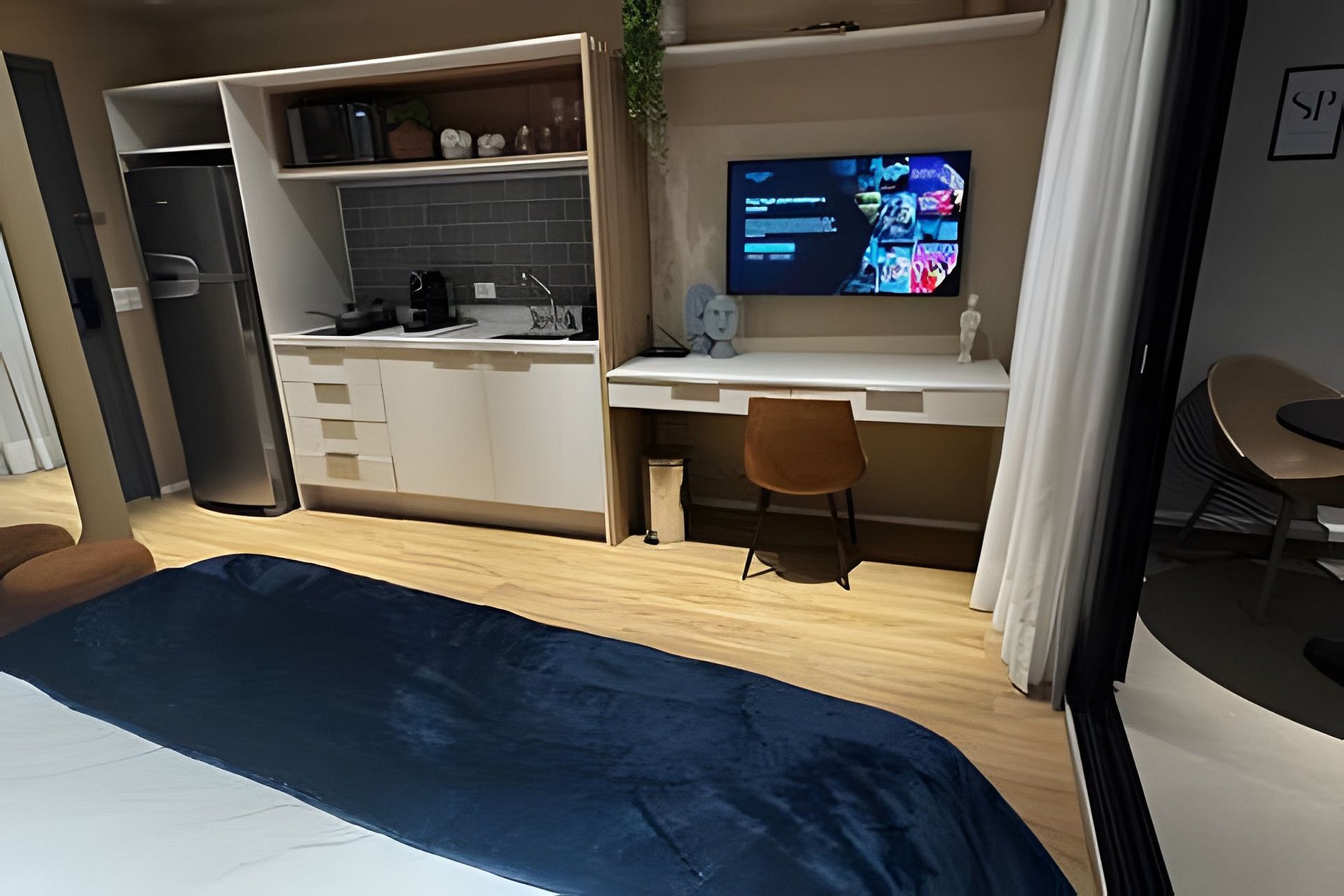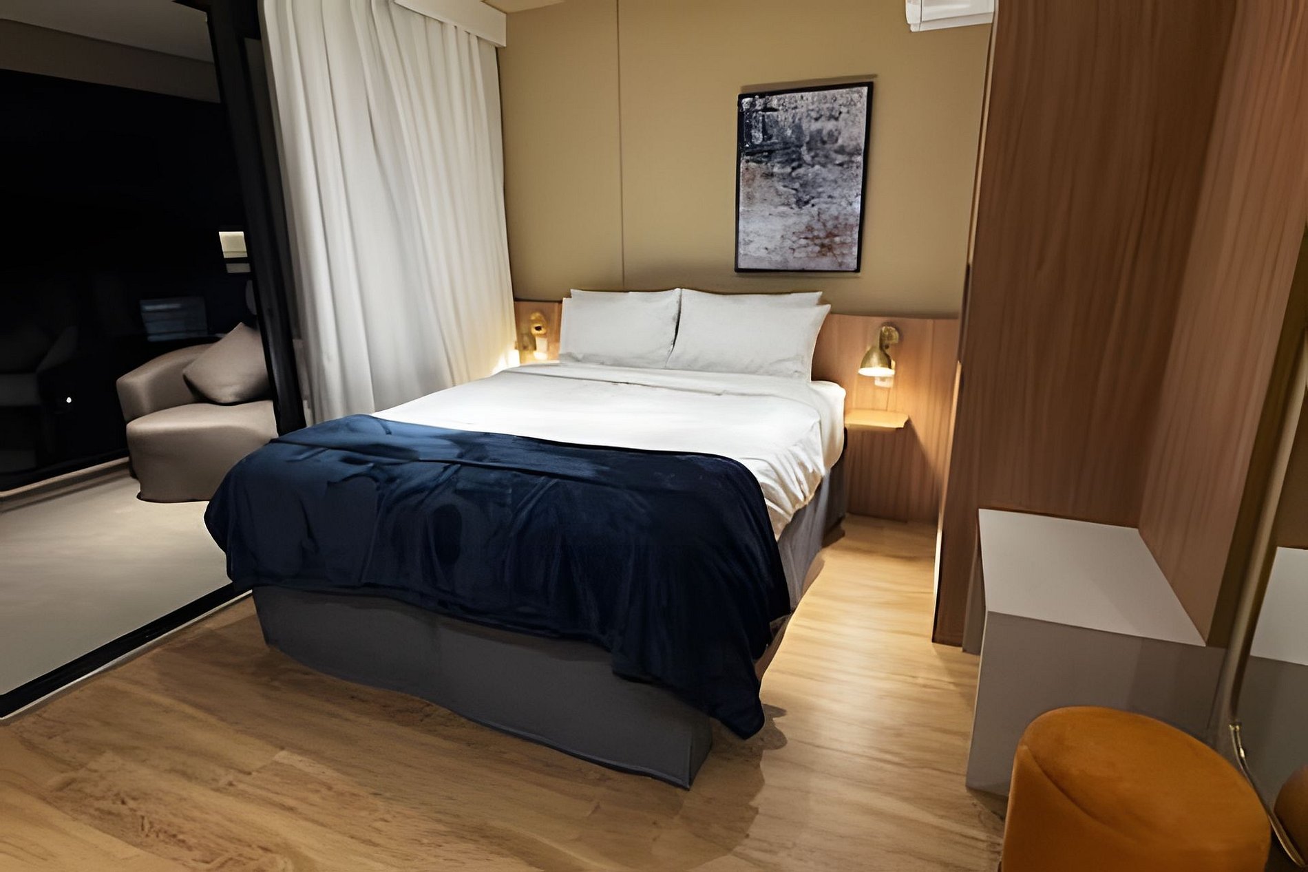 ᐅ Studio: cama queen size, roupas de cama, cortina blackout, Wifi 500Mbps, Tv Smart com canais de antena digital, ar condicionado split, fechadura eletrônica.