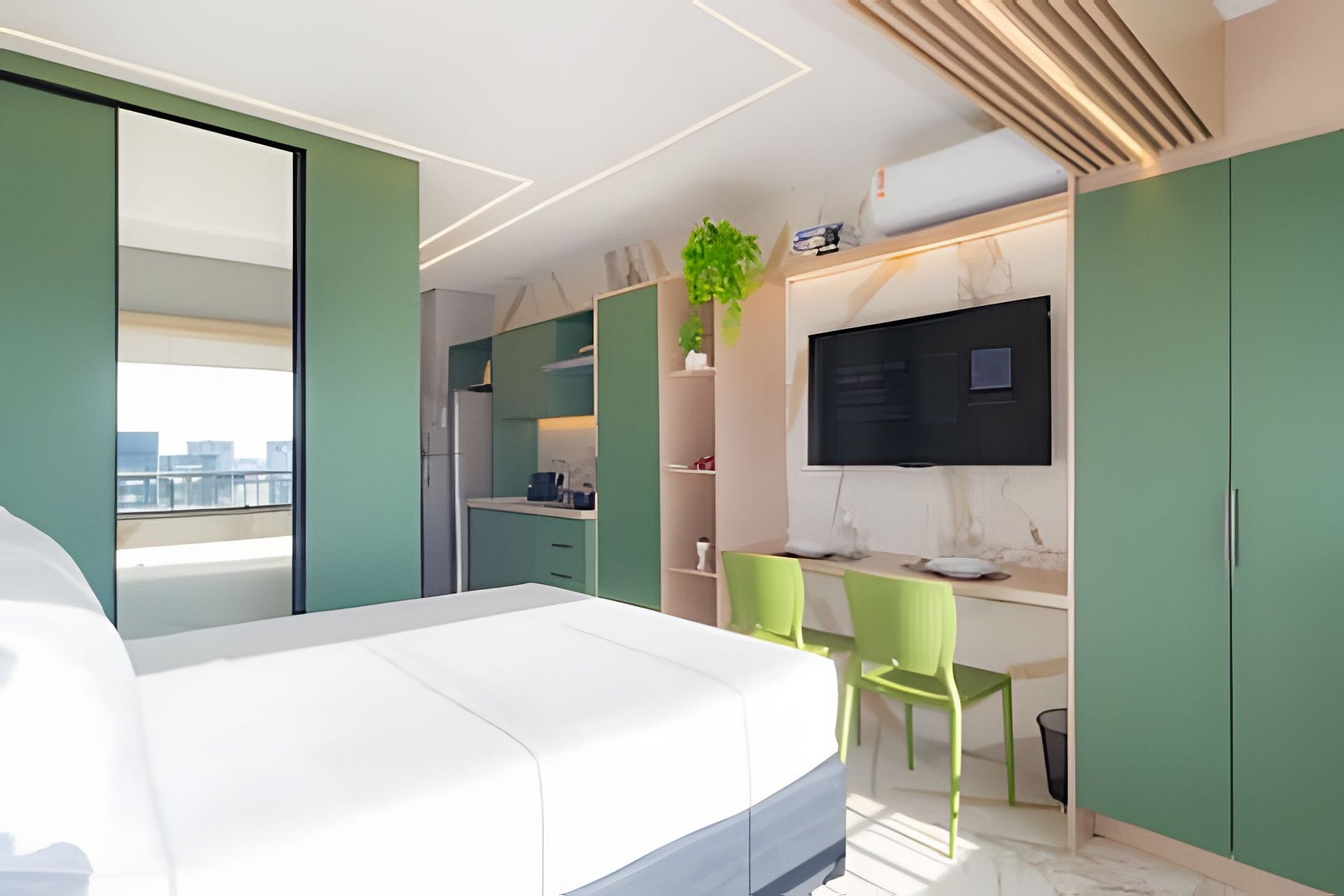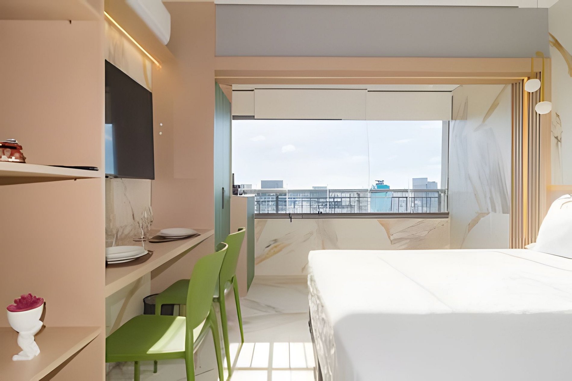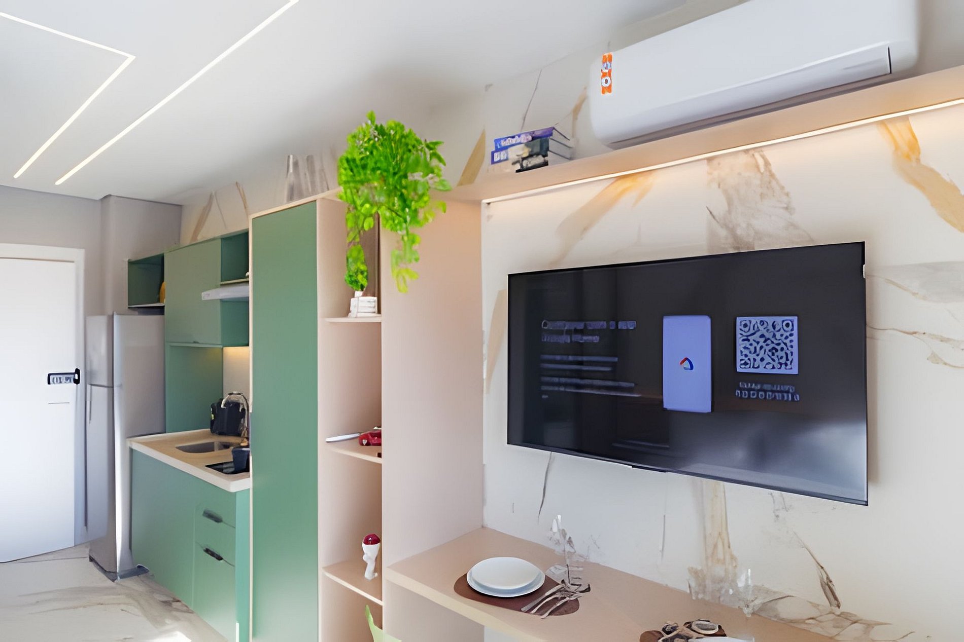 ▷ Studio: cama queen size, sofá cama casal, enxoval padrão hotel, Wifi 500Mbps, Tv Smart, ar condicionado split, mesa para refeições e trabalho, ferro de passar ou vaporizador e fechadura eletrônica.