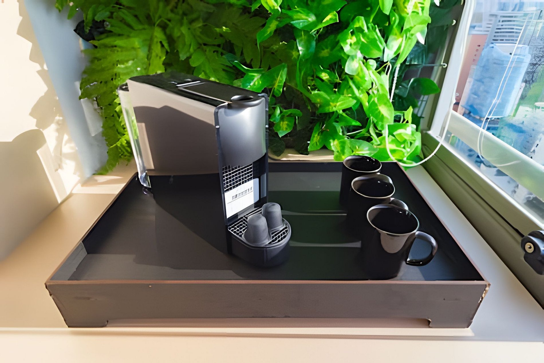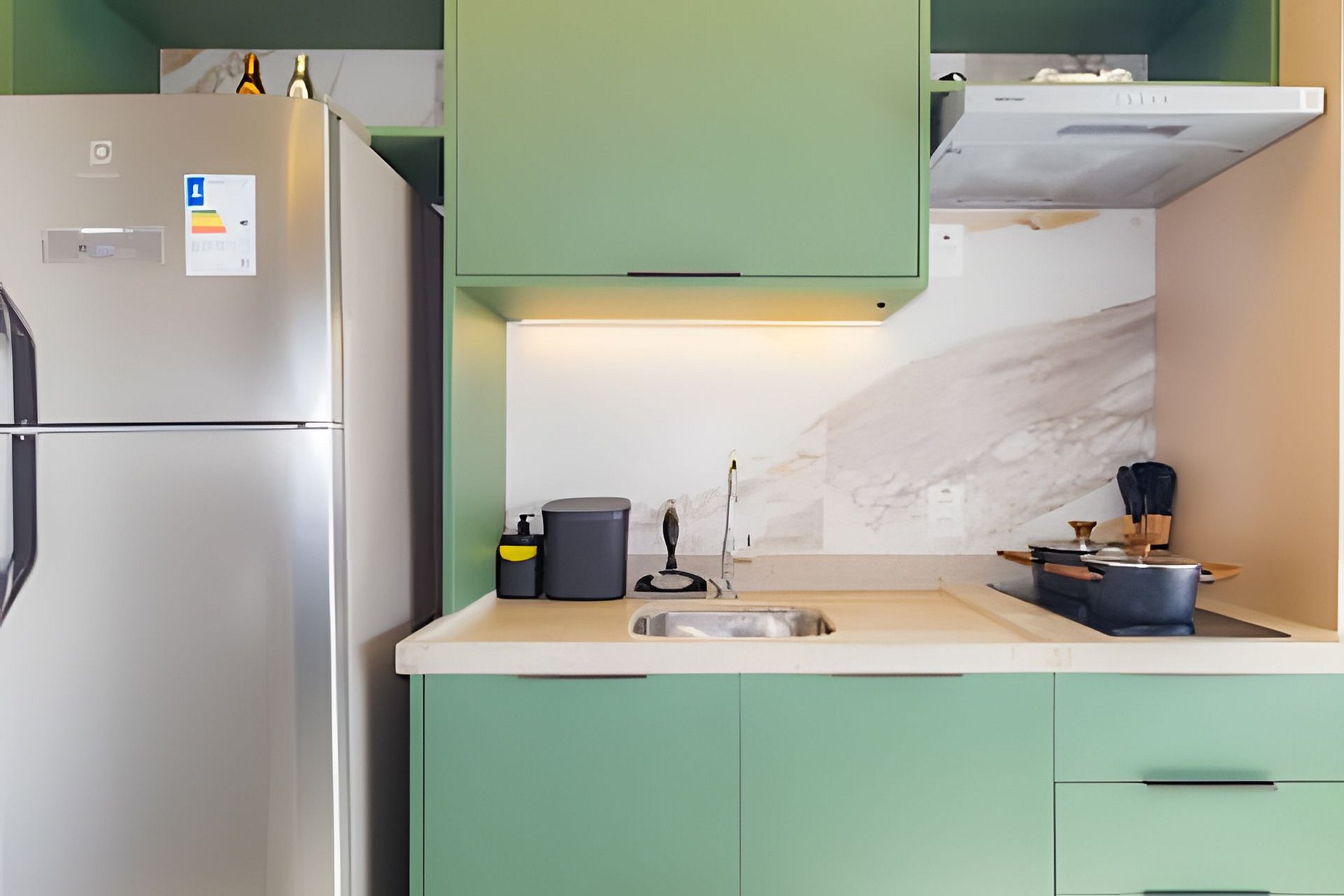 ▷ Cozinha integrada: totalmente equipada com cooktop, airfryer, micro-ondas, geladeira, cafeteira Nespresso, liquidificador, copos, taças, pratos, talheres, panelas e utensílios de cozinha.