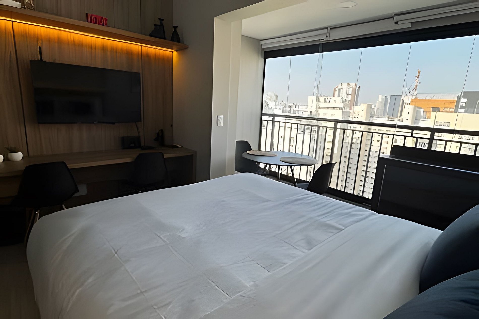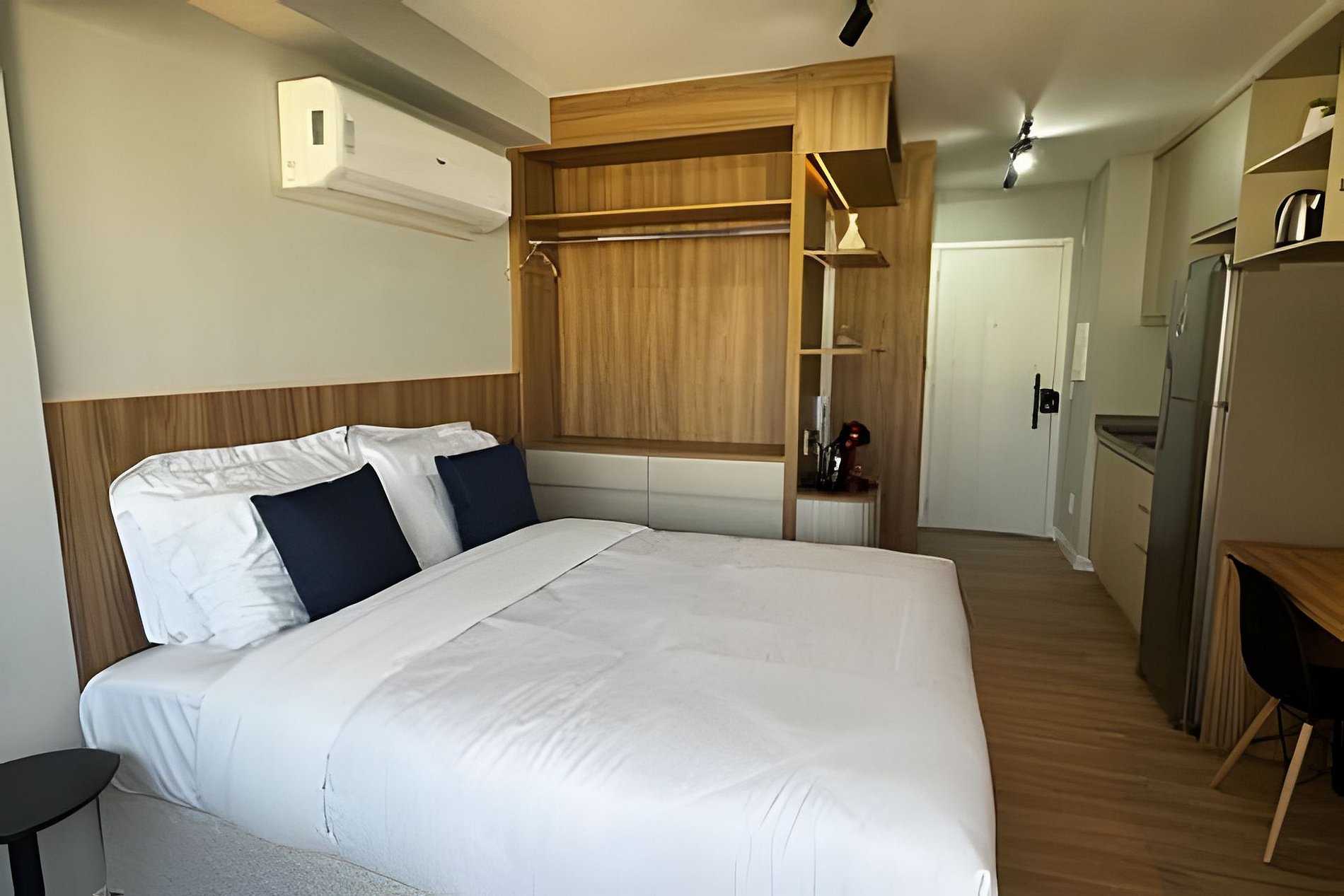 ▷ Studio: cama queen size, enxoval padrão hotel, Wifi 500Mbps, Tv Smart, ar condicionado split, mesa para refeições e trabalho, ferro de passar ou vaporizador e fechadura eletrônica.