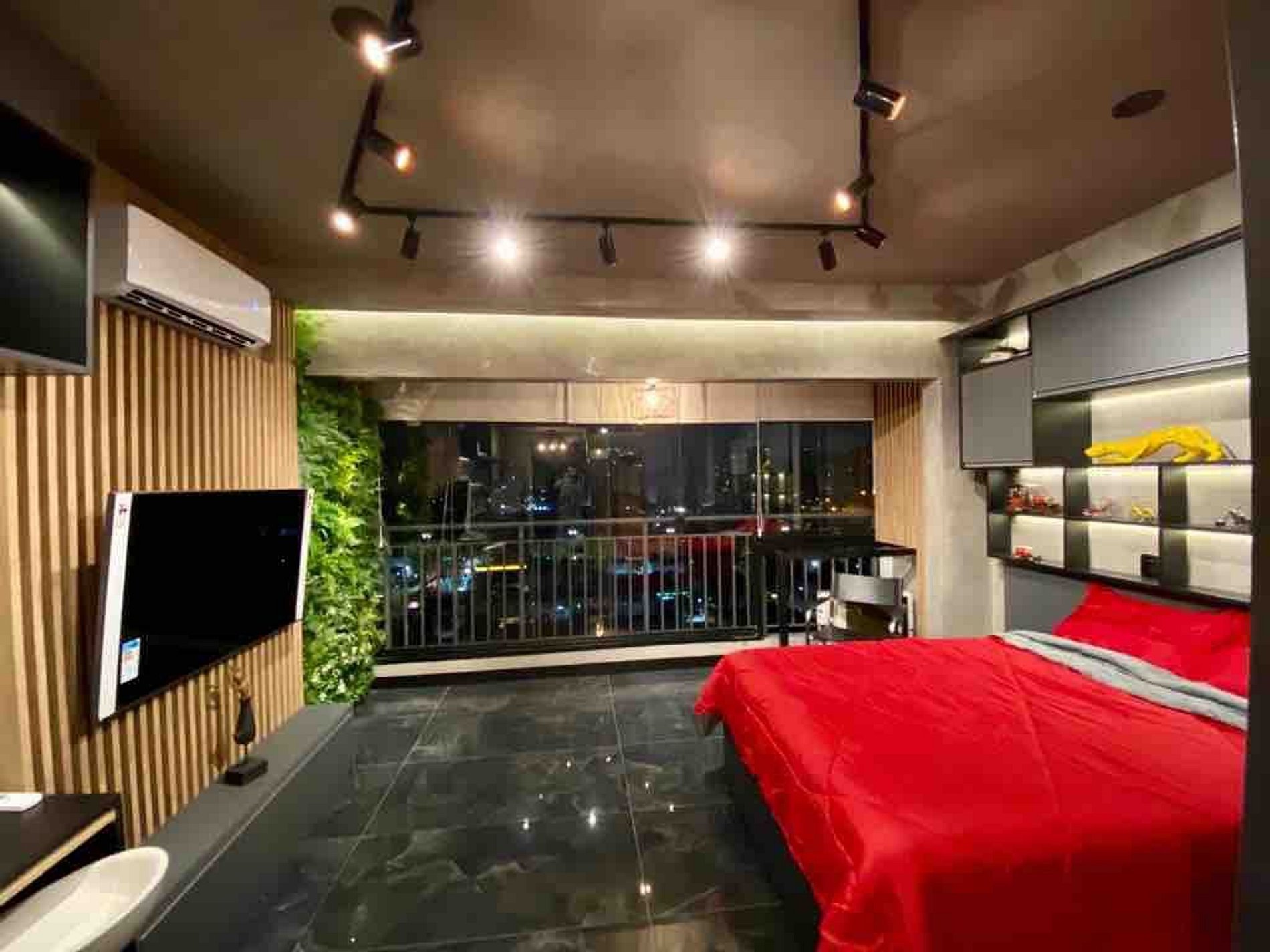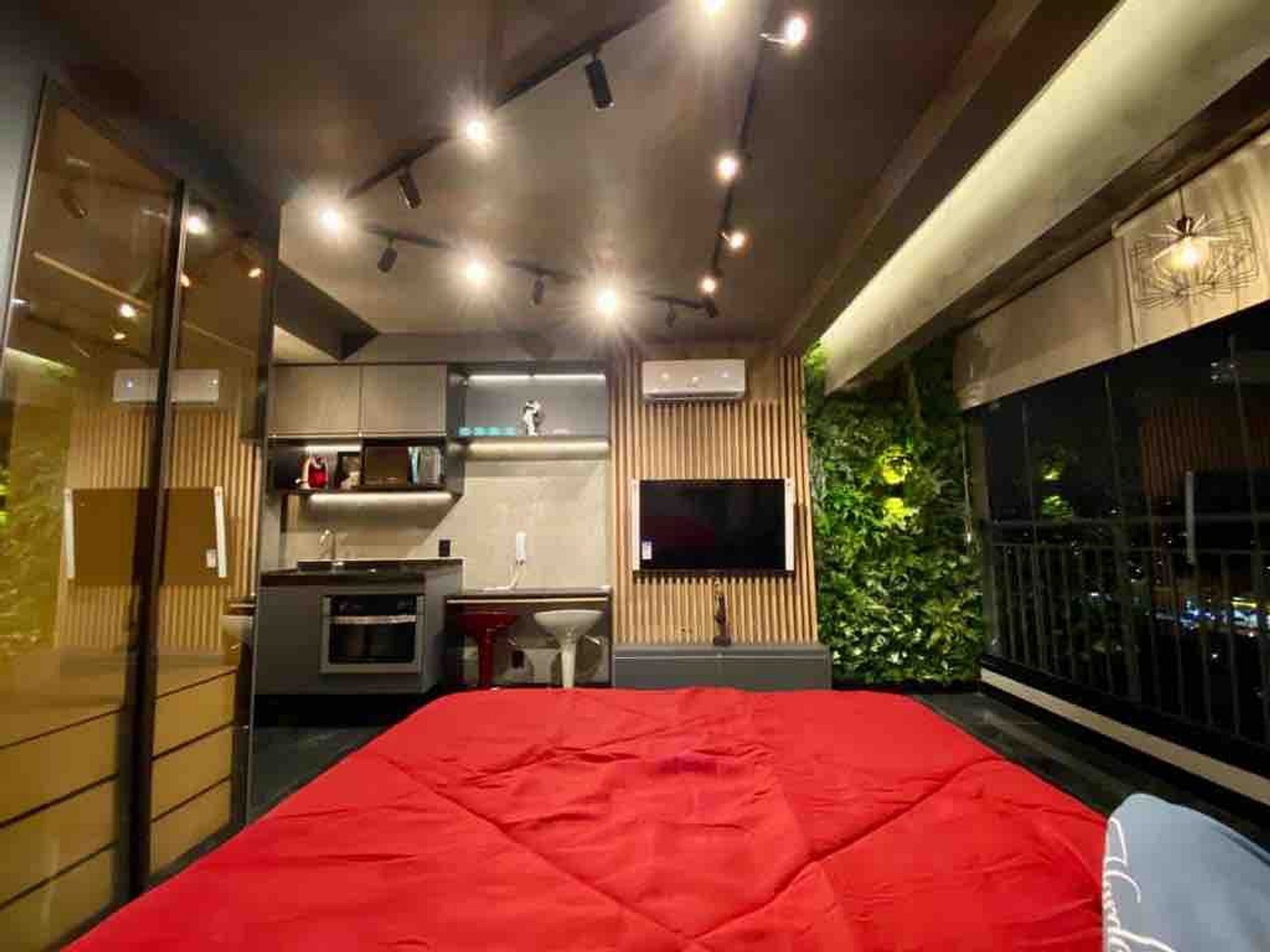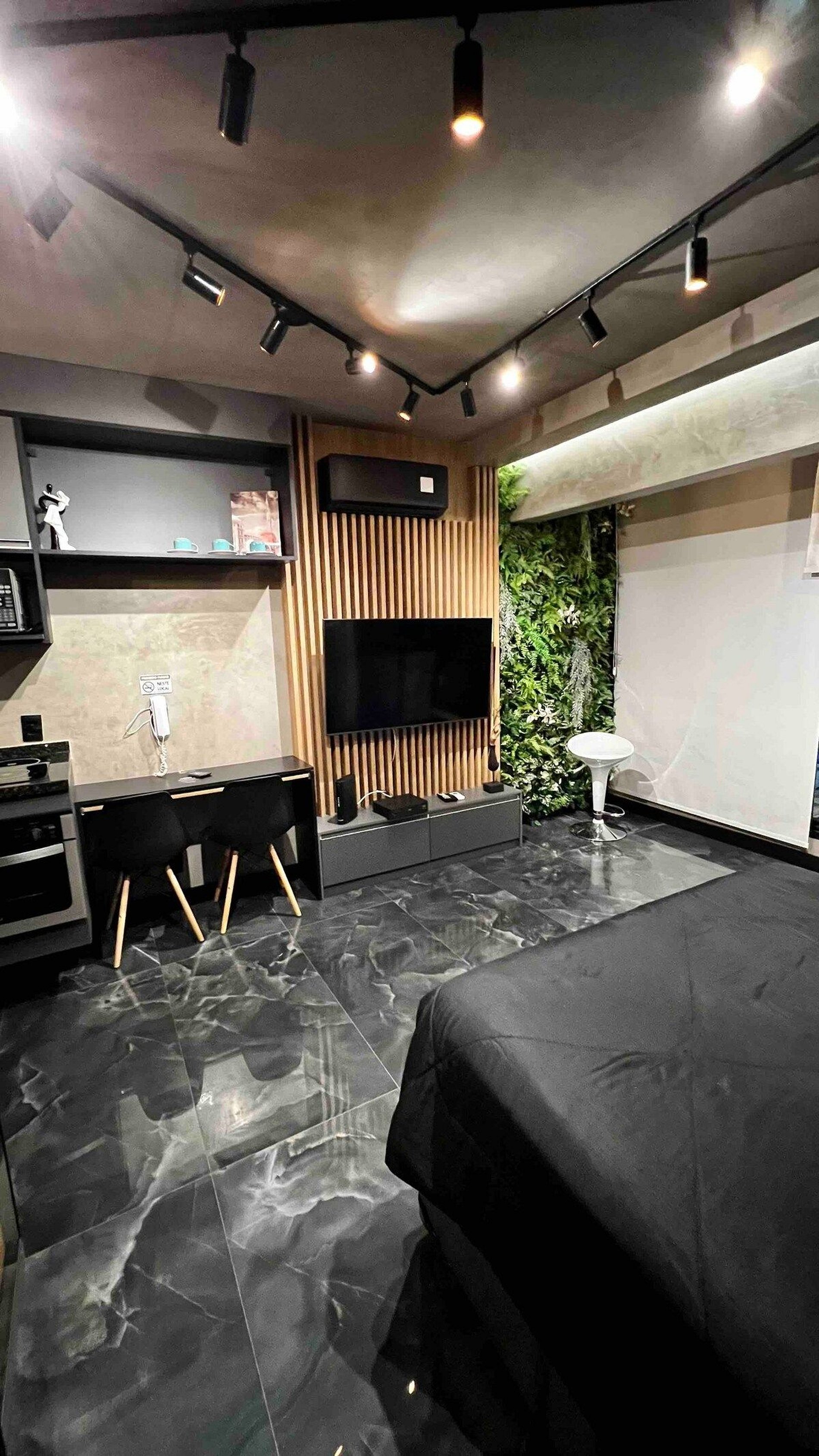 ᐅ Studio: cama de casal, roupas de cama, cortina blackout, Wifi 500Mbps, Tv Smart com canais a cabo e todos os aplicativos de streaming, ar condicionado split, fechadura eletrônica.