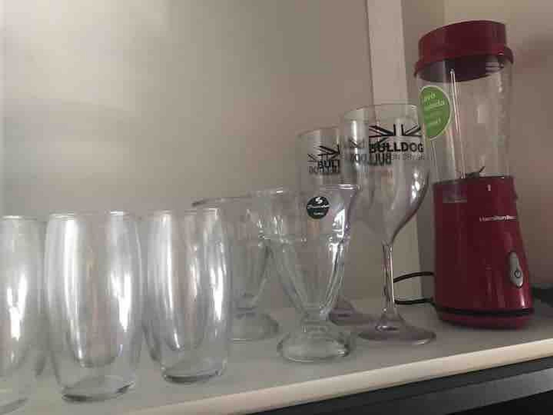 ᐅ Cozinha integrada: totalmente equipada com fogão, forno, micro-ondas, geladeira, cafeteira Três Corações, copos, taças, pratos, talheres, panelas e utensílios de cozinha.