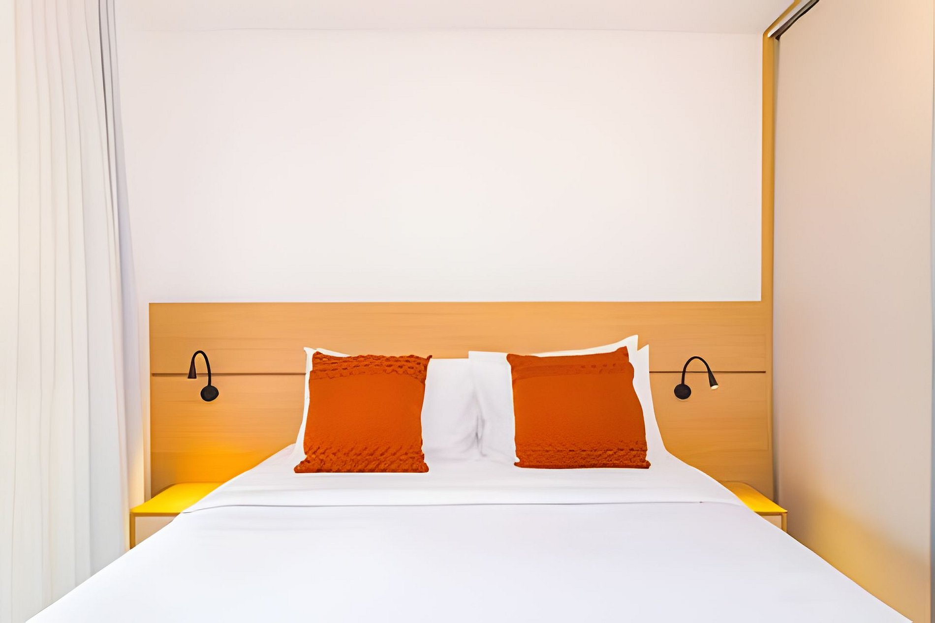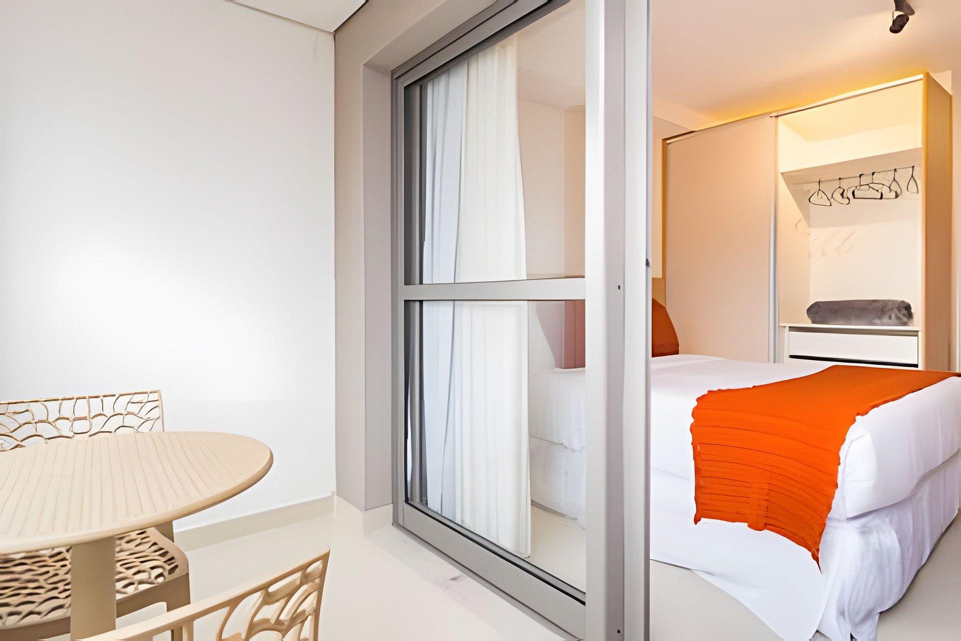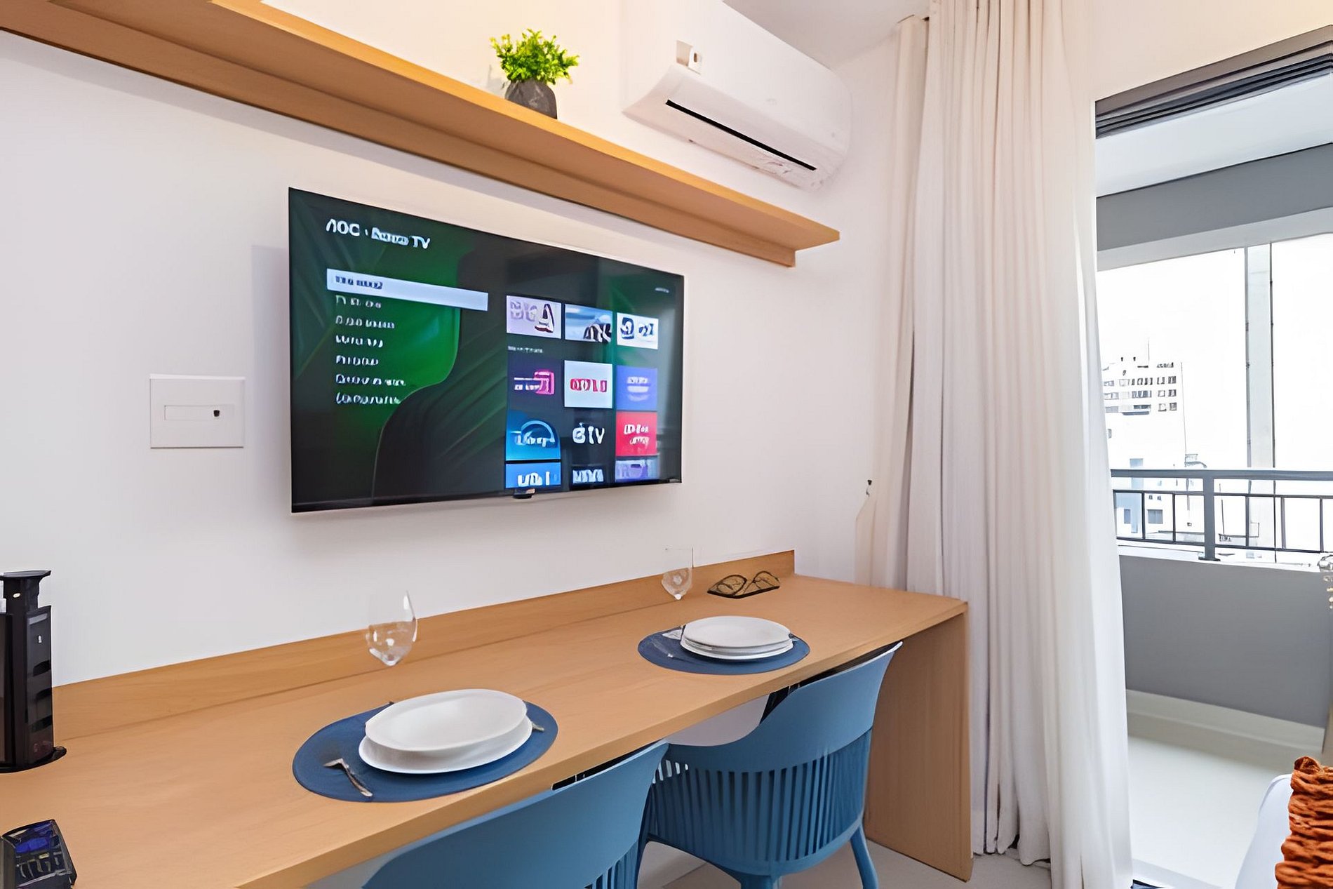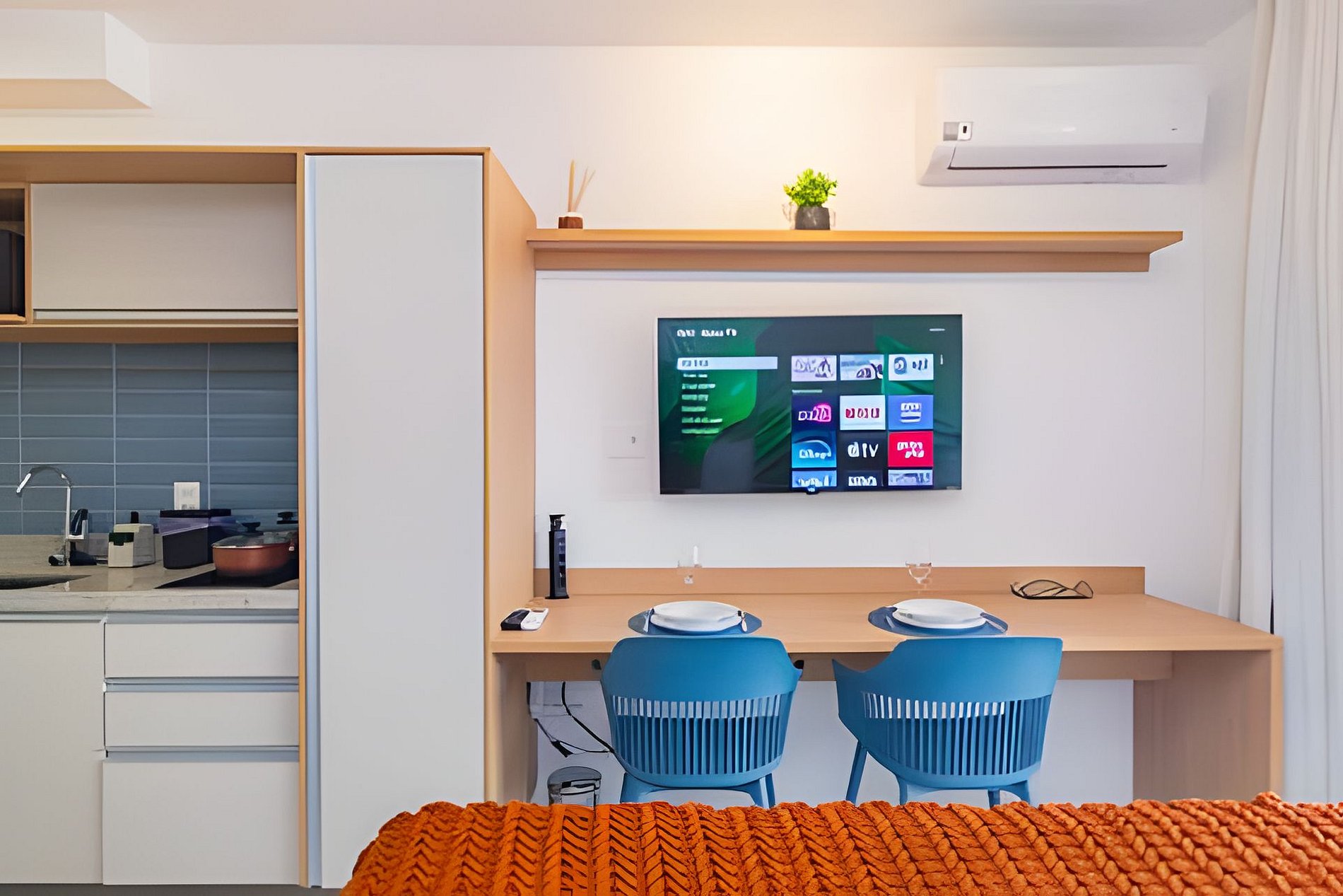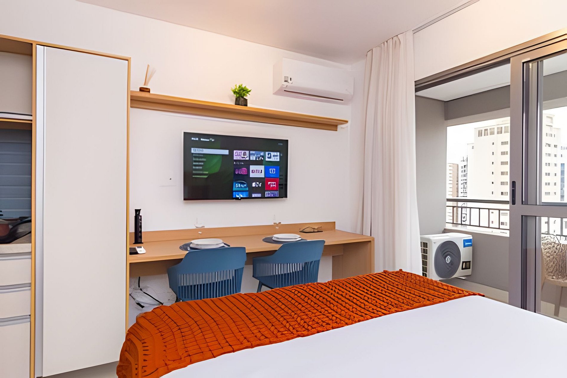 ▷ Studio: cama queen size, enxoval padrão hotel, Wifi 500Mbps, Tv Smart, ar condicionado split, mesa para refeições e trabalho, ferro de passar ou vaporizador e fechadura eletrônica.