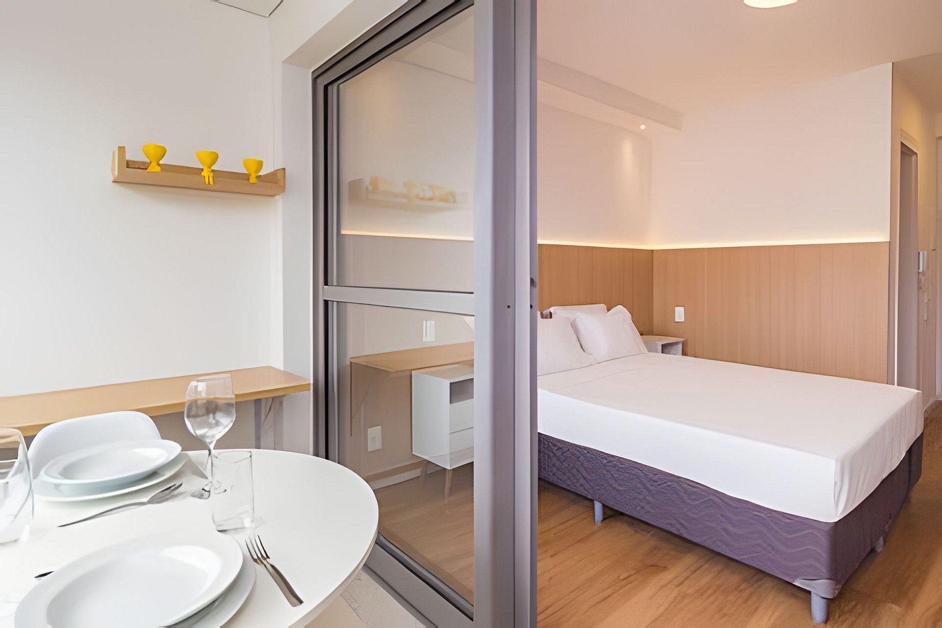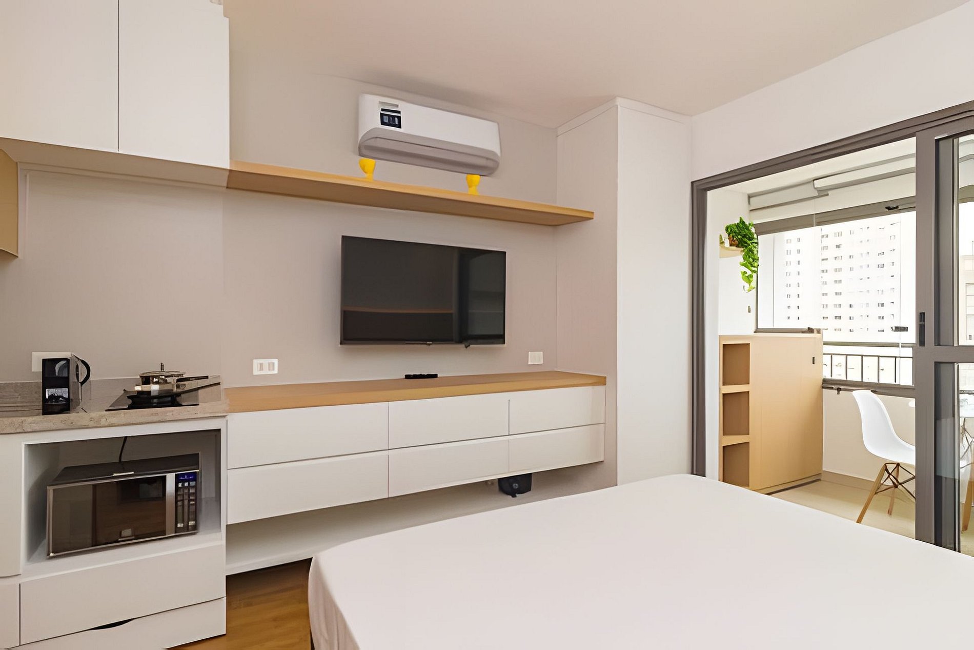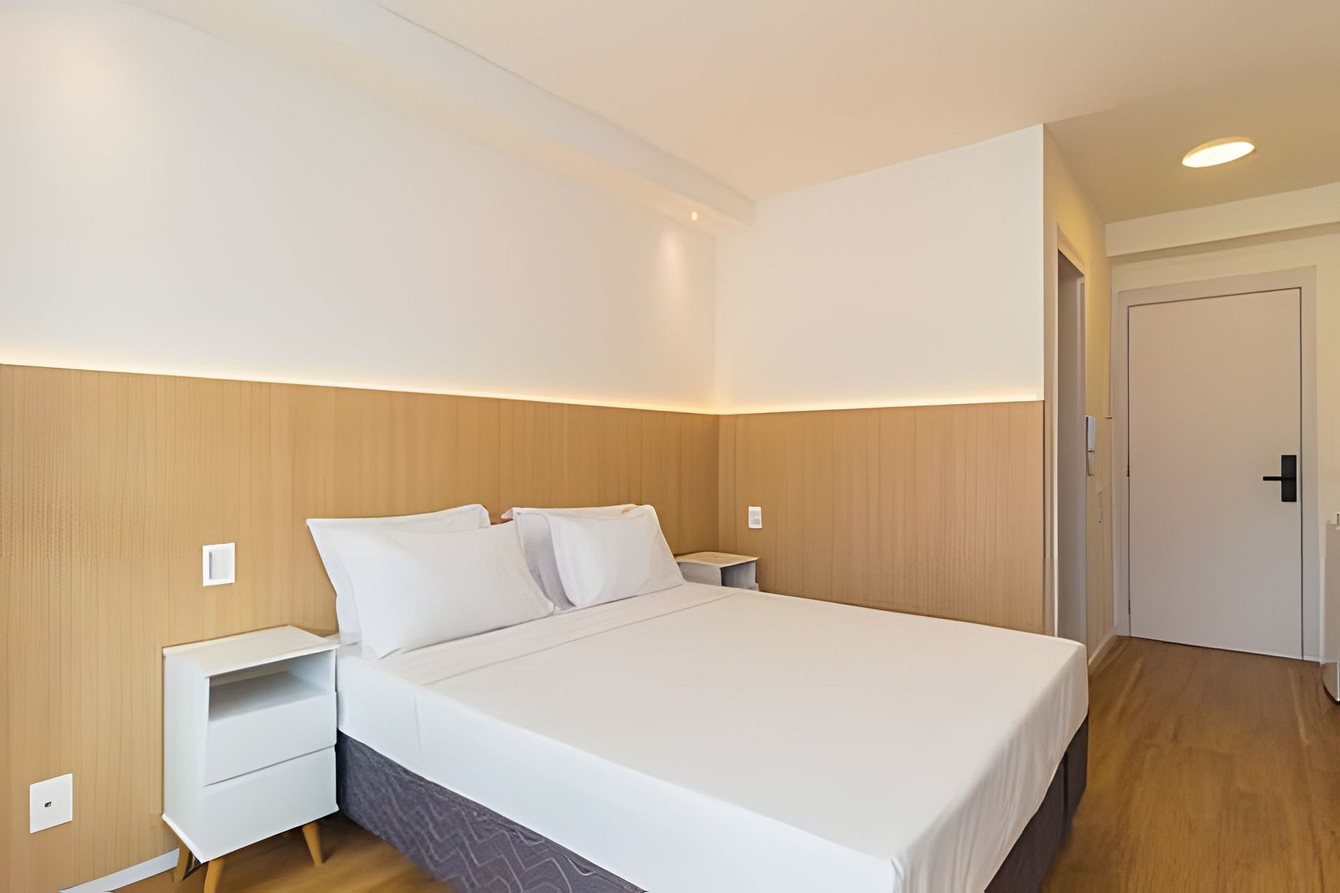▷ Studio: cama queen size, enxoval padrão hotel, Wifi 500Mbps, Tv Smart, ar condicionado split, mesa para refeições e trabalho, ferro de passar ou vaporizador e fechadura eletrônica.