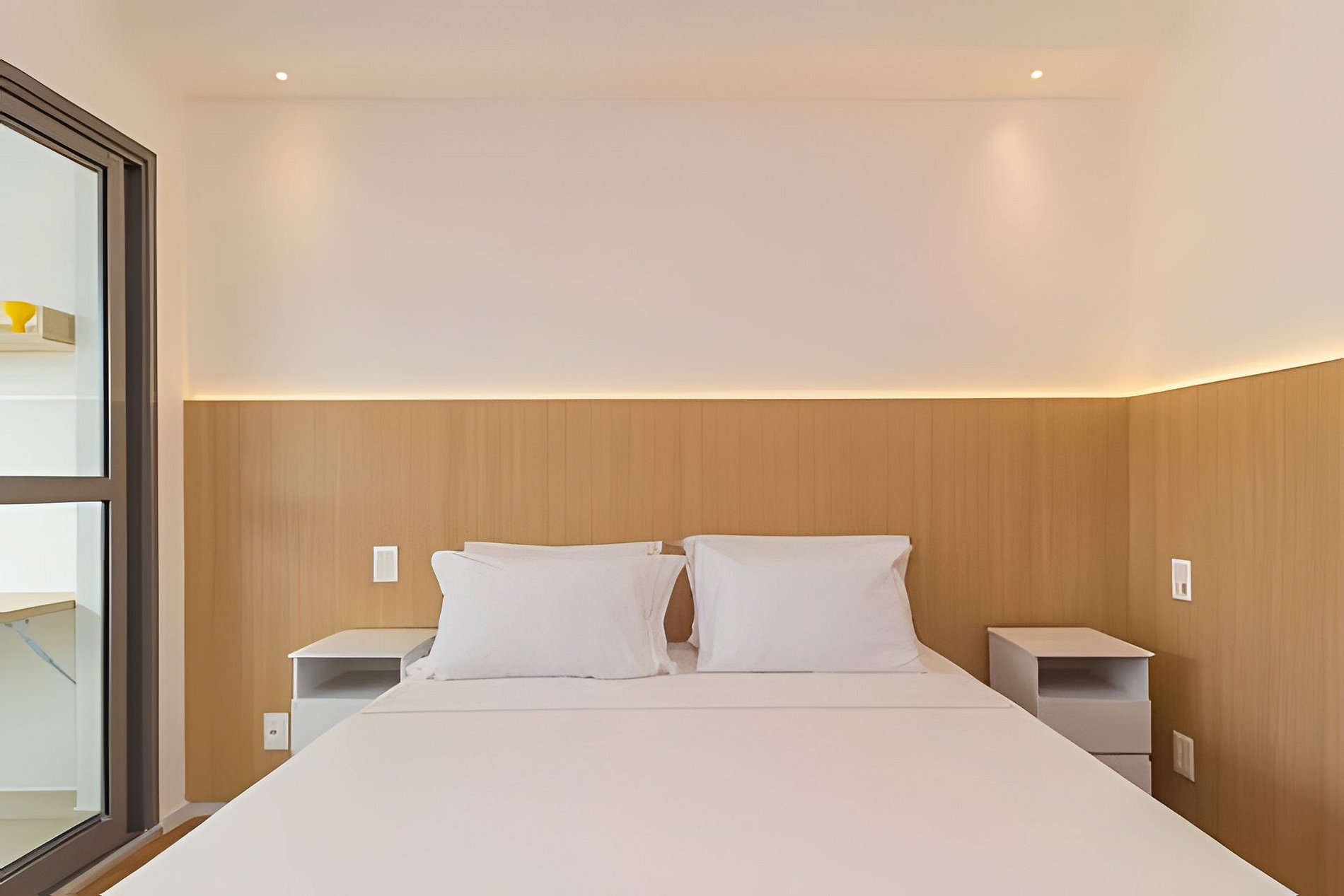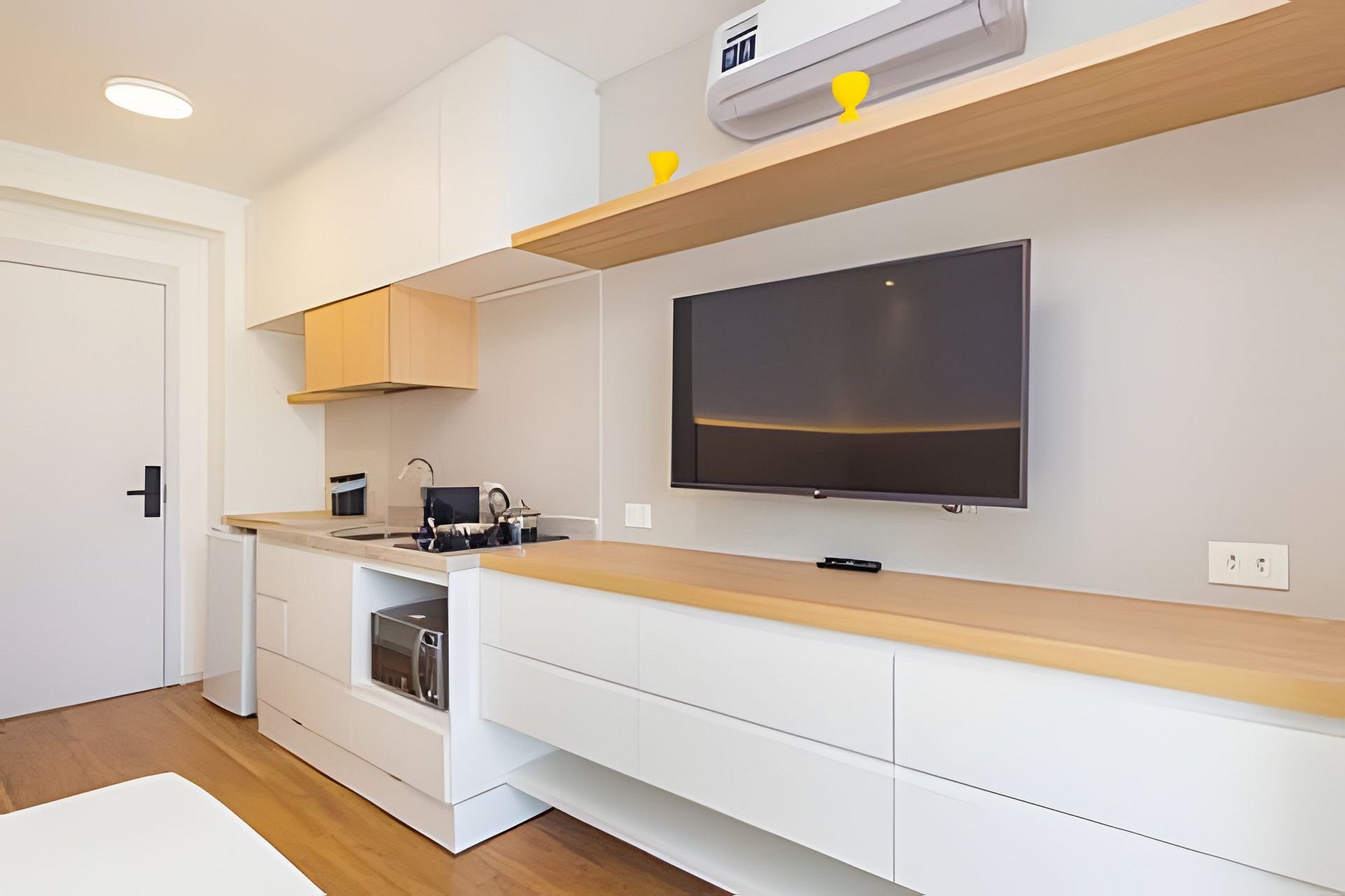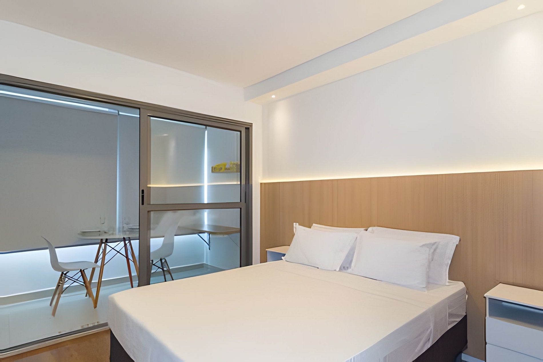 ▷ Studio: cama queen size, enxoval padrão hotel, Wifi 500Mbps, Tv Smart, ar condicionado split, mesa para refeições e trabalho, ferro de passar ou vaporizador e fechadura eletrônica.