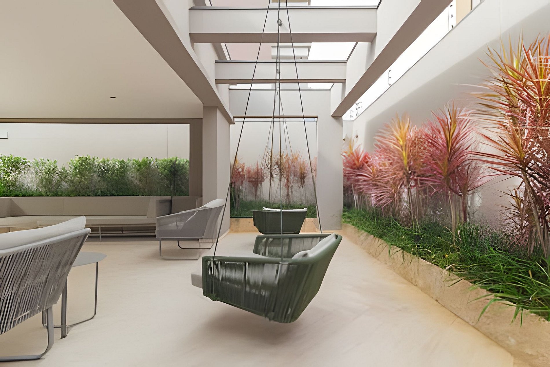 ᐅ Espaço ao ar livre com sofás e balanços