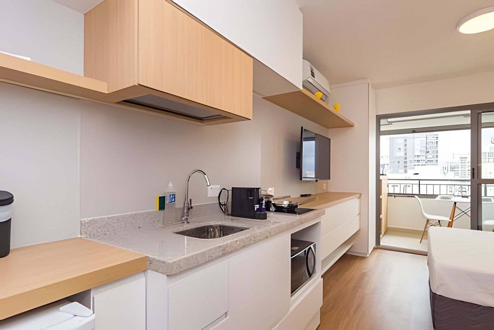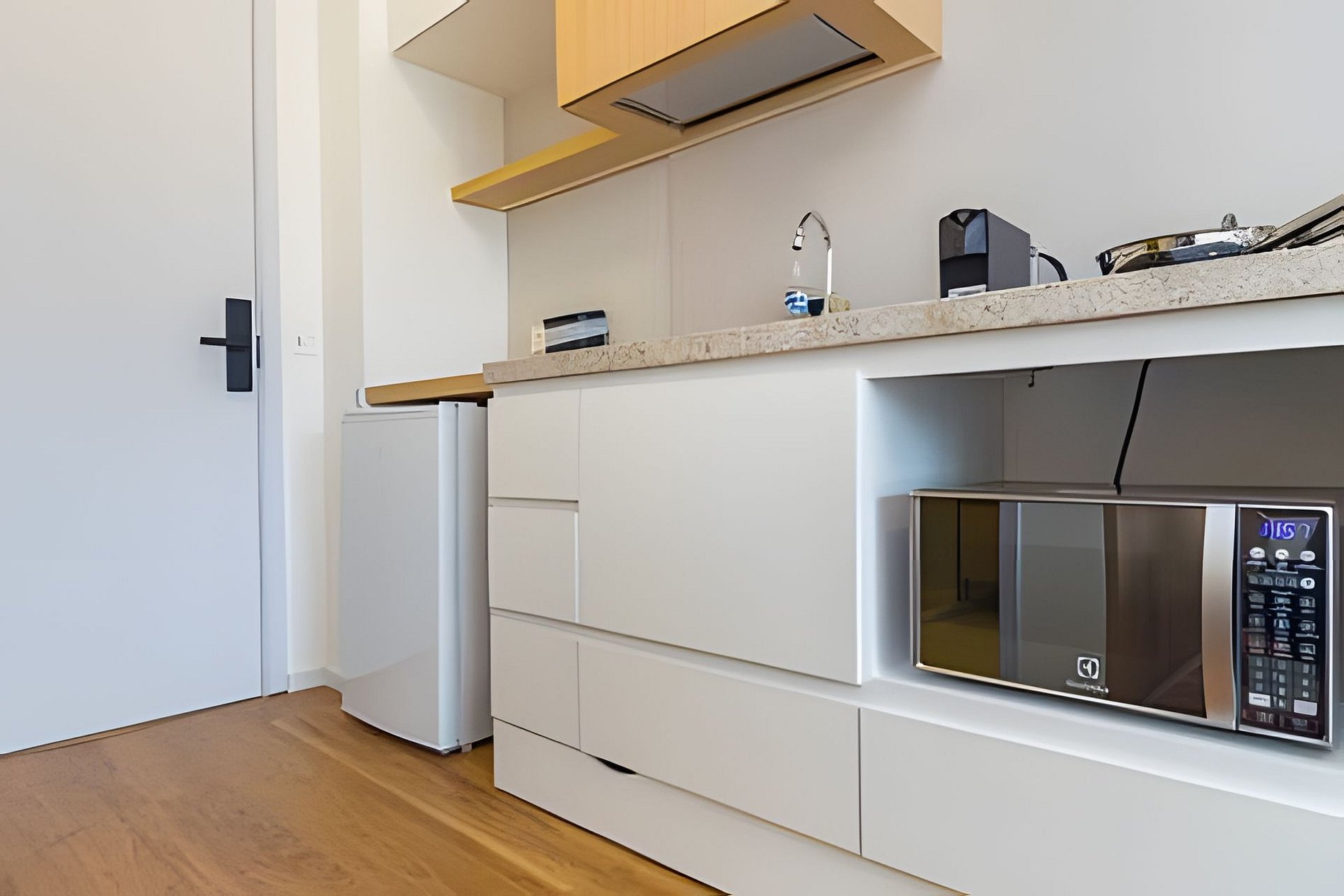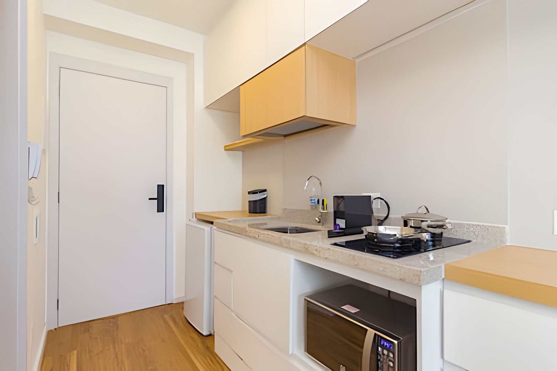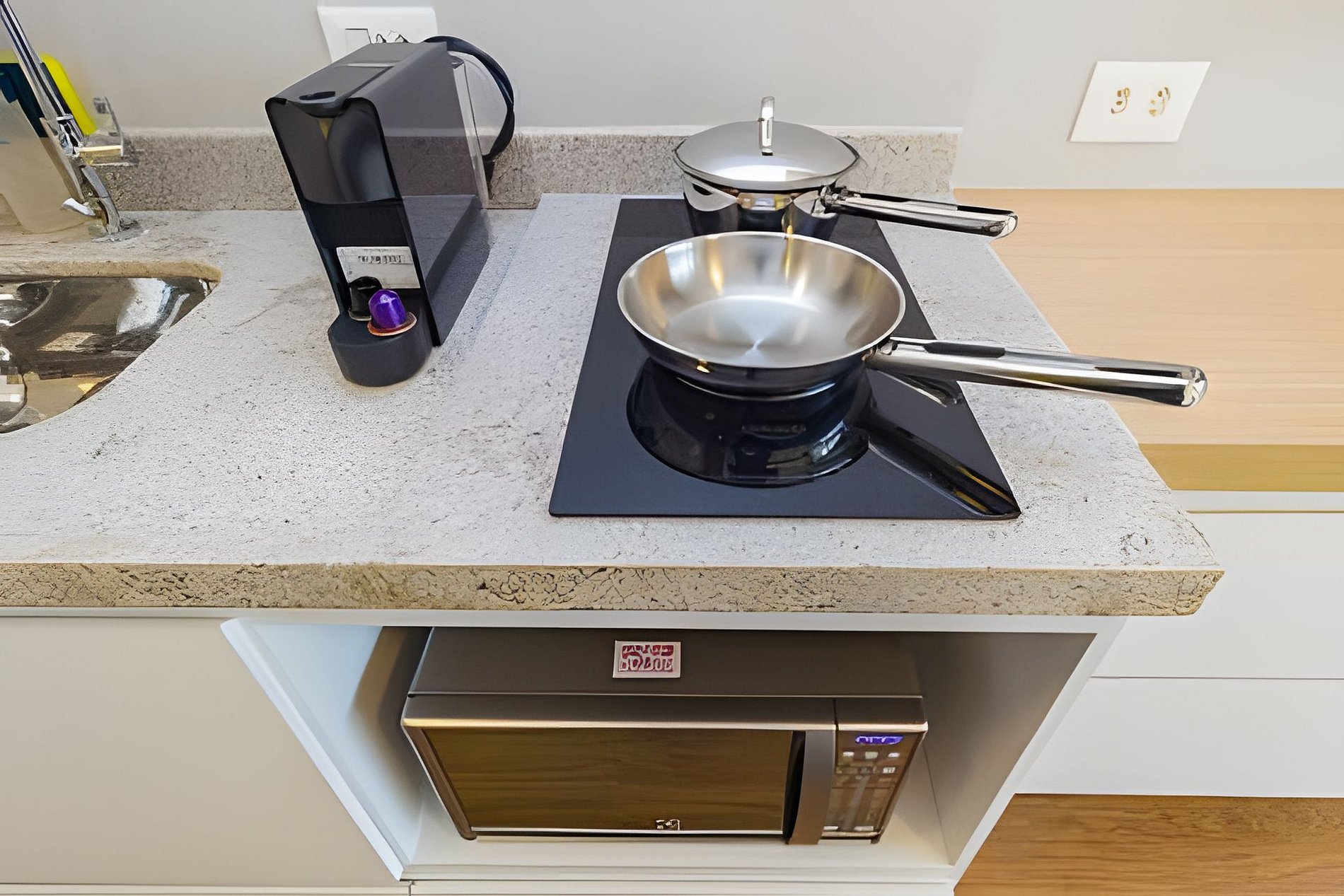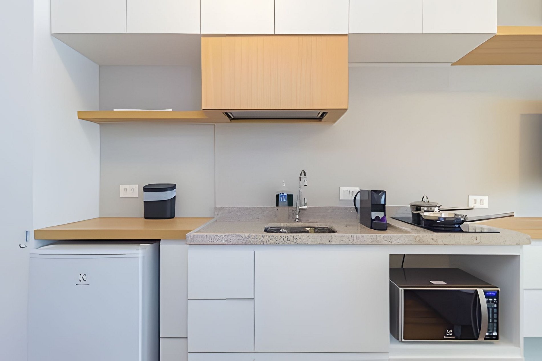 ▷ Cozinha integrada: totalmente equipada com cooktop, micro-ondas, frigobar, cafeteira Nespresso, liquidificador, copos, taças, pratos, talheres, panelas e utensílios de cozinha.