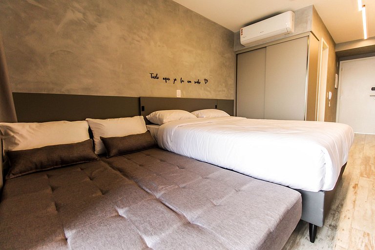 - Studio: cama queen size, sofá-cama casal, roupas de cama padrão hotel, cortina blackout, Wifi 500Mbps, Tv Smart com todos os aplicativos de streaming, ar condicionado split, ferro de passar ou vaporizador e fechadura eletrônica.