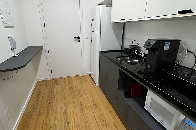 ᐅ Cozinha integrada: totalmente equipada com geladeira, cooktop de indução 2 bocas, micro-ondas, cafeteira Nespresso, copos, taças, pratos, talheres, e utensílios de cozinha, além de balcão para refeição.