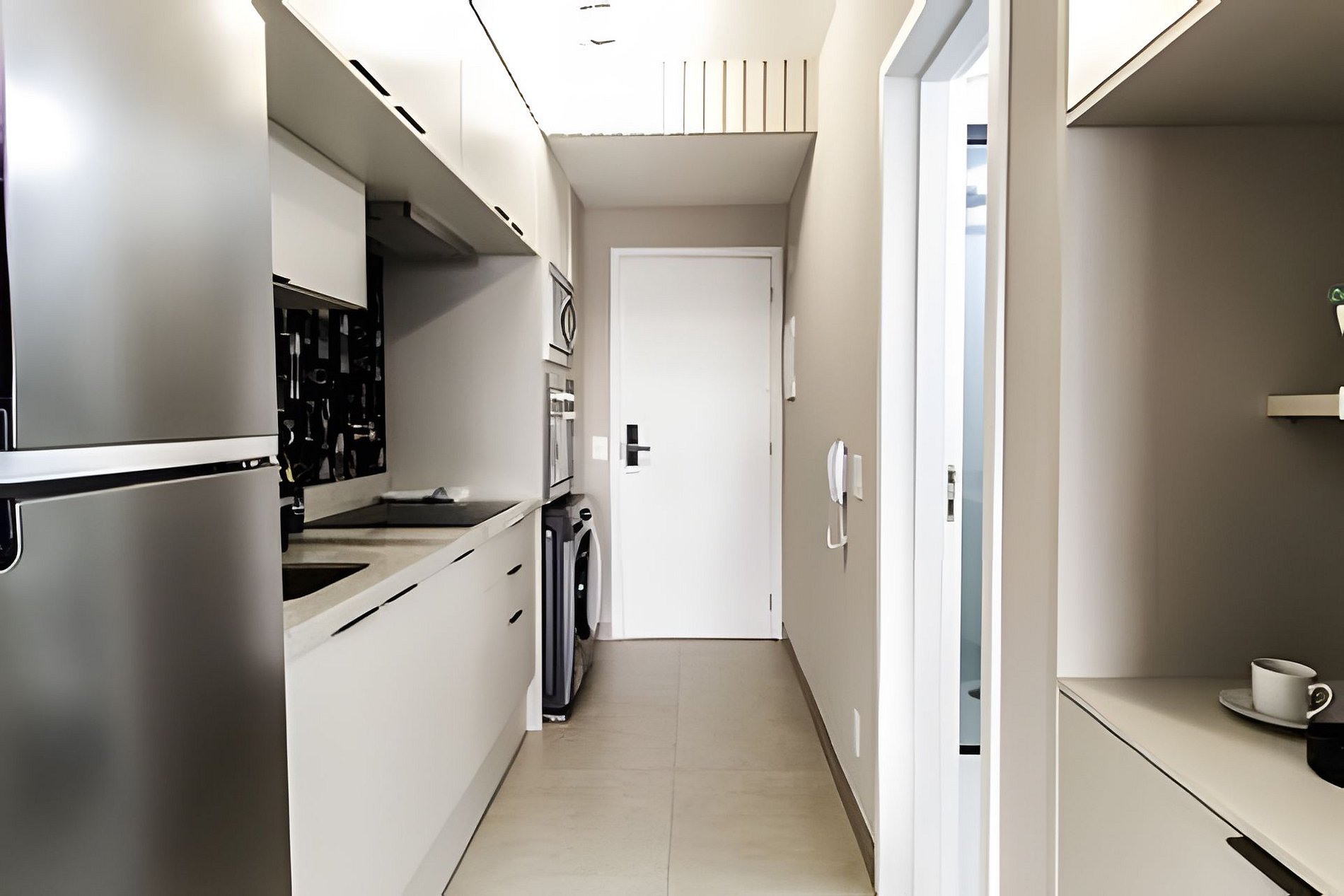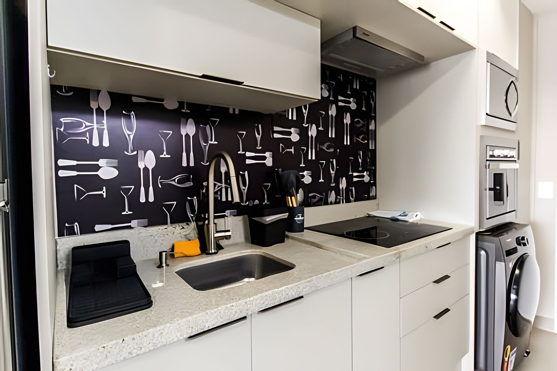 ▷ Cozinha integrada: totalmente equipada com cooktop de indução (4 bocas), forno, micro-ondas, geladeira, cafeteira Nespresso, copos, taças, xícaras, pratos, talheres, panelas e utensílios de cozinha. Além de máquina lava e seca.