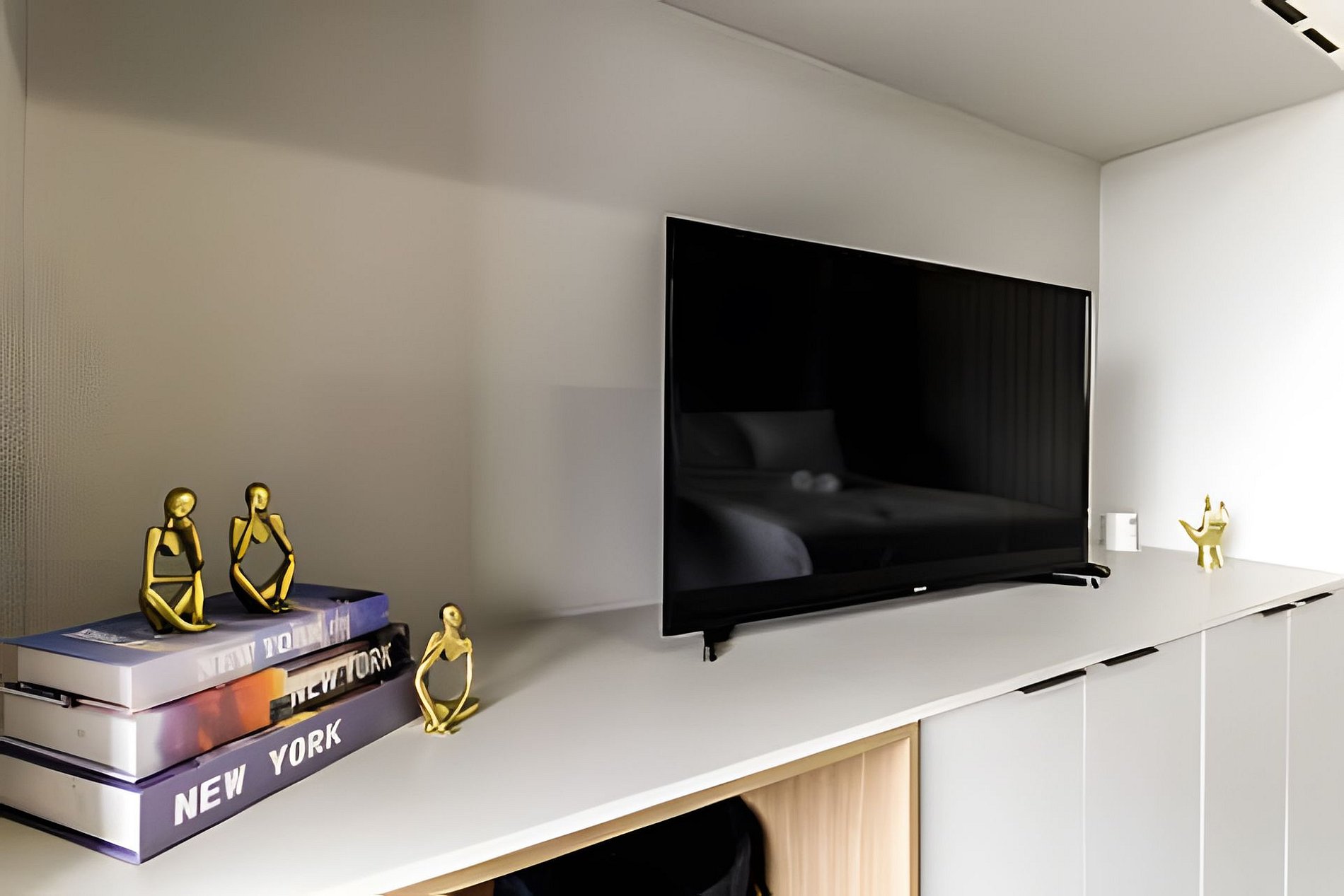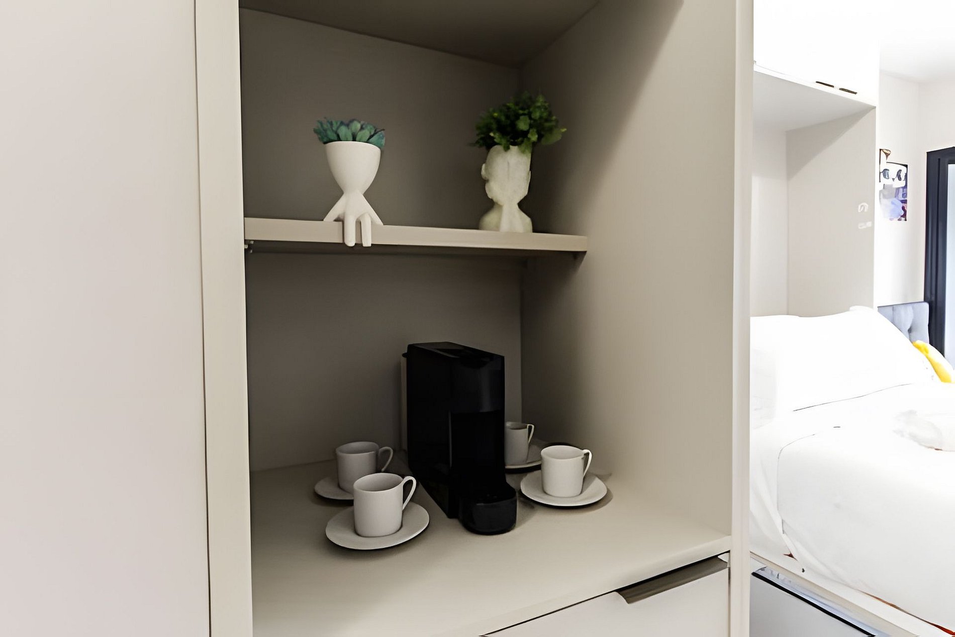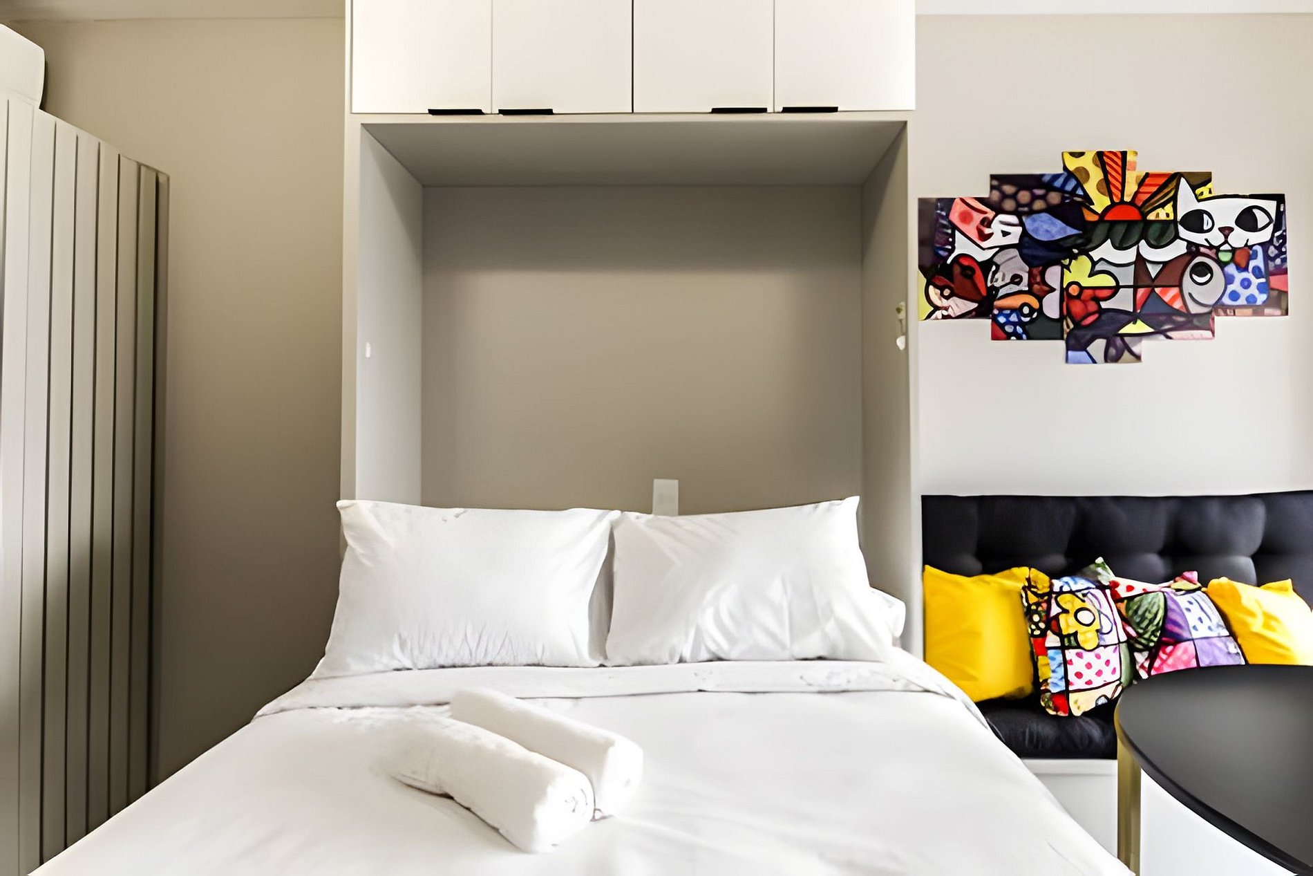 ▷ Studio: cama casal, roupas de cama padrão hotel, cortina blackout, Wifi 500Mbps, Tv Smart com todos os aplicativos de streaming, ar condicionado split, ferro de passar ou vaporizador e fechadura eletrônica.