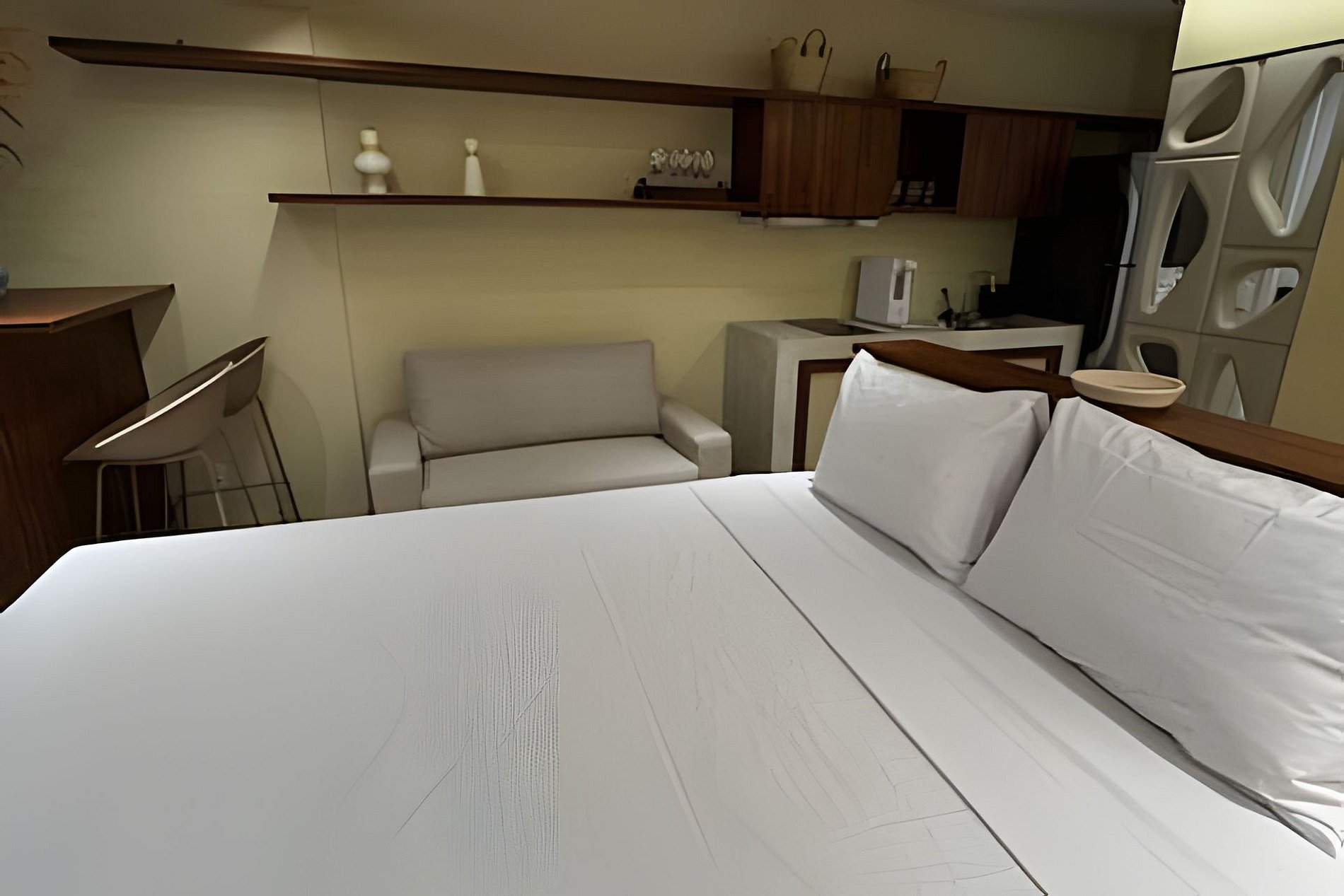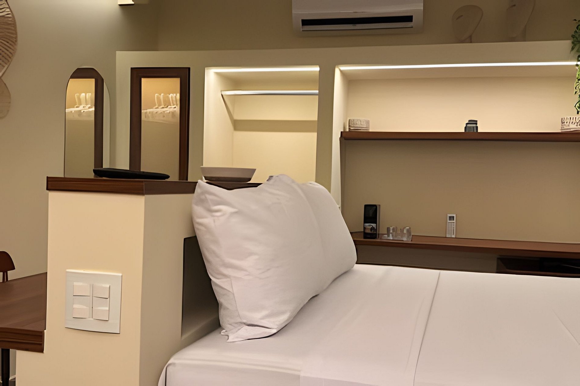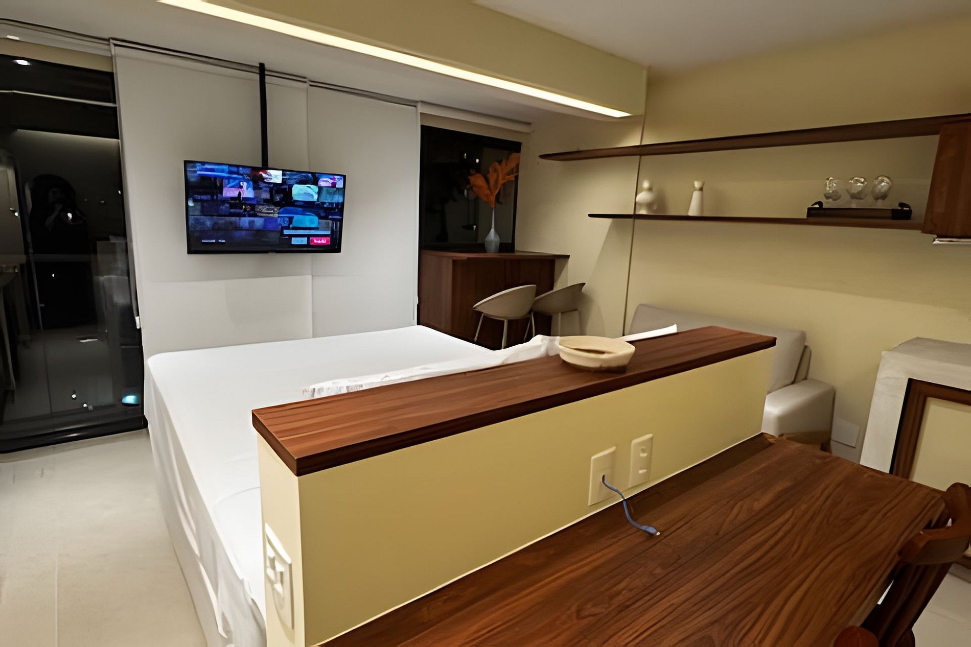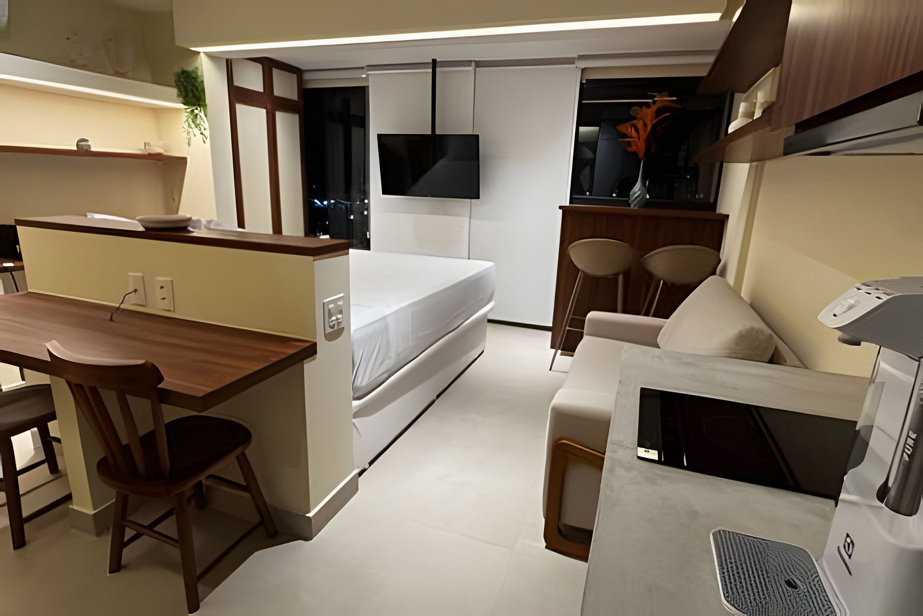 ▷ Studio: cama queen size, sofá, roupas de cama padrão hotel, cortina blackout, Wifi 500Mbps, Tv Smart com todos os aplicativos de streaming, ar condicionado split, ferro de passar ou vaporizador e fechadura eletrônica.