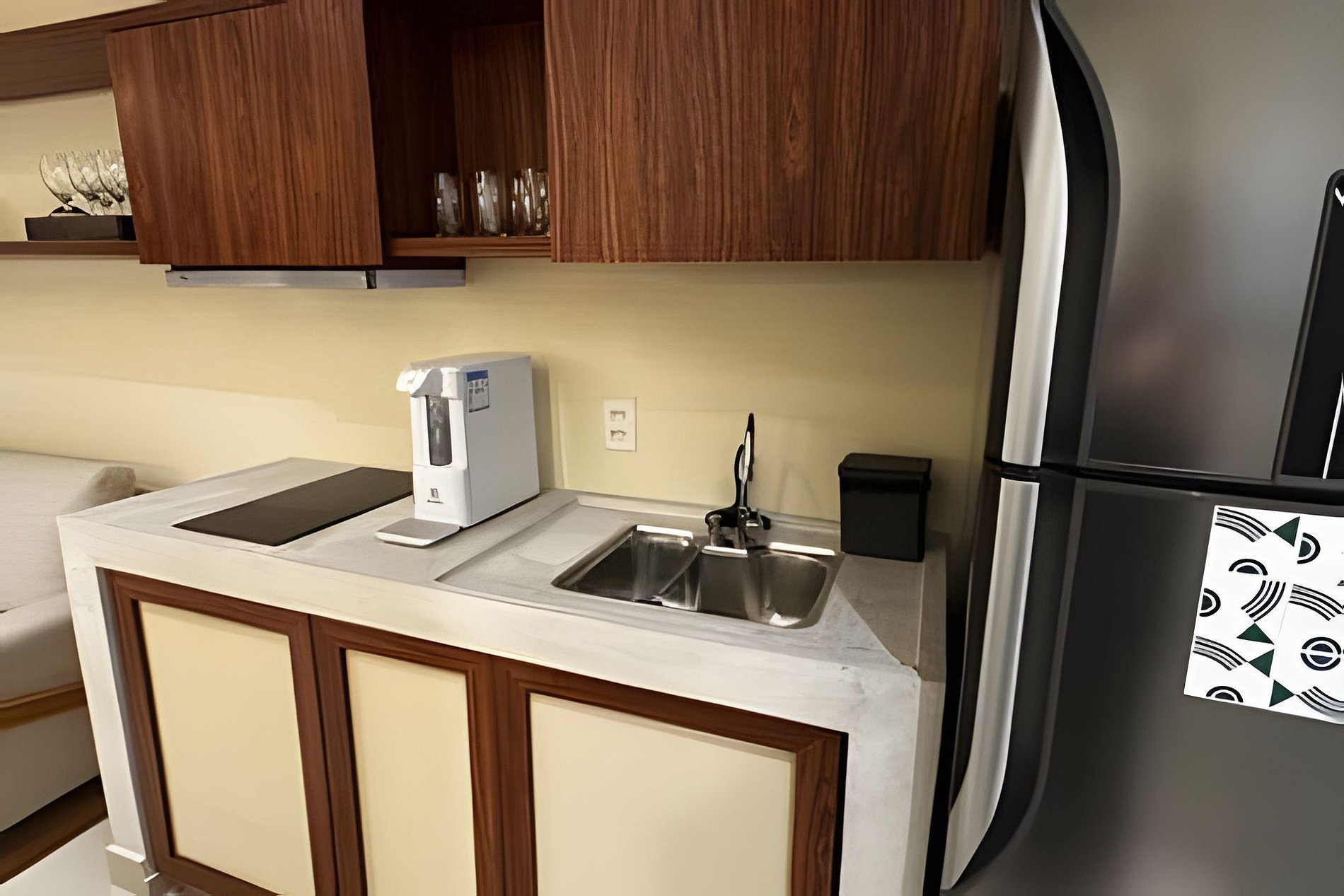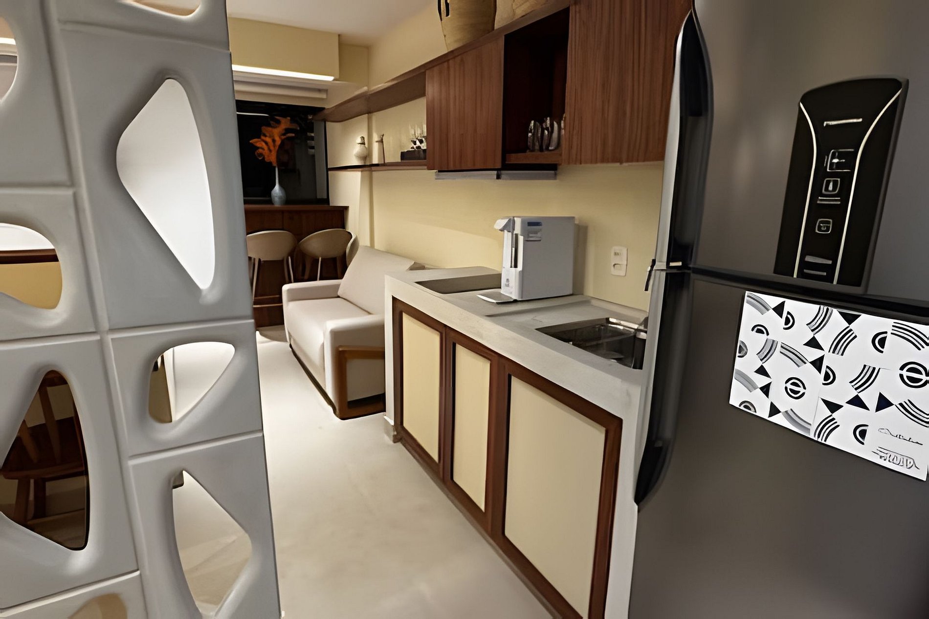 ▷ Cozinha integrada: totalmente equipada com fogão de indução, micro-ondas, geladeira, filtro de água, cafeteira Nespresso, liquidificador, airfryer, sanduicheira e todos os utensílios de cozinha.