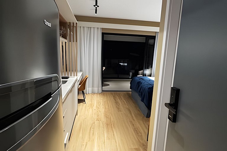 ᐅ Studio: cama queen size, roupas de cama, cortina blackout, Wifi 500Mbps, Tv Smart com canais de antena digital, ar condicionado split, fechadura eletrônica.