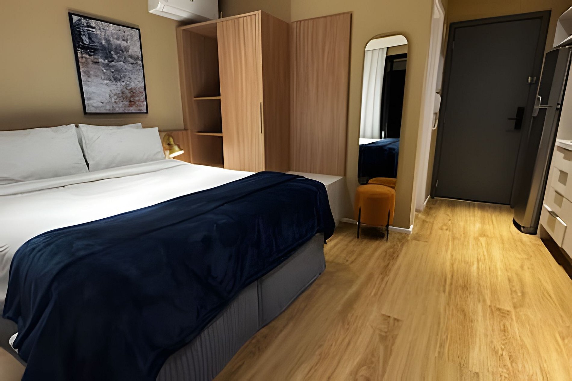 ᐅ Studio: cama queen size, roupas de cama, cortina blackout, Wifi 500Mbps, Tv Smart com canais de antena digital, ar condicionado split, fechadura eletrônica.