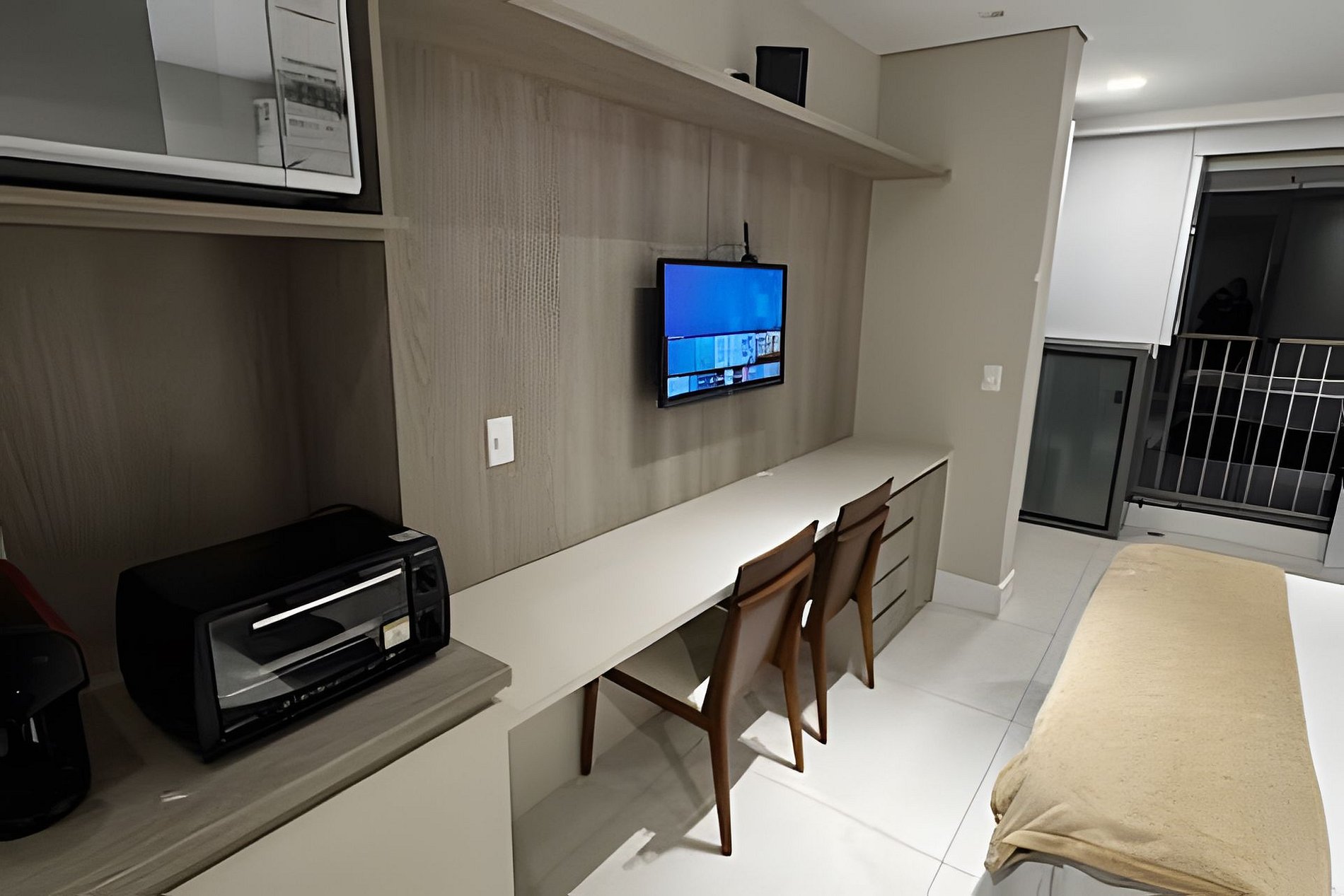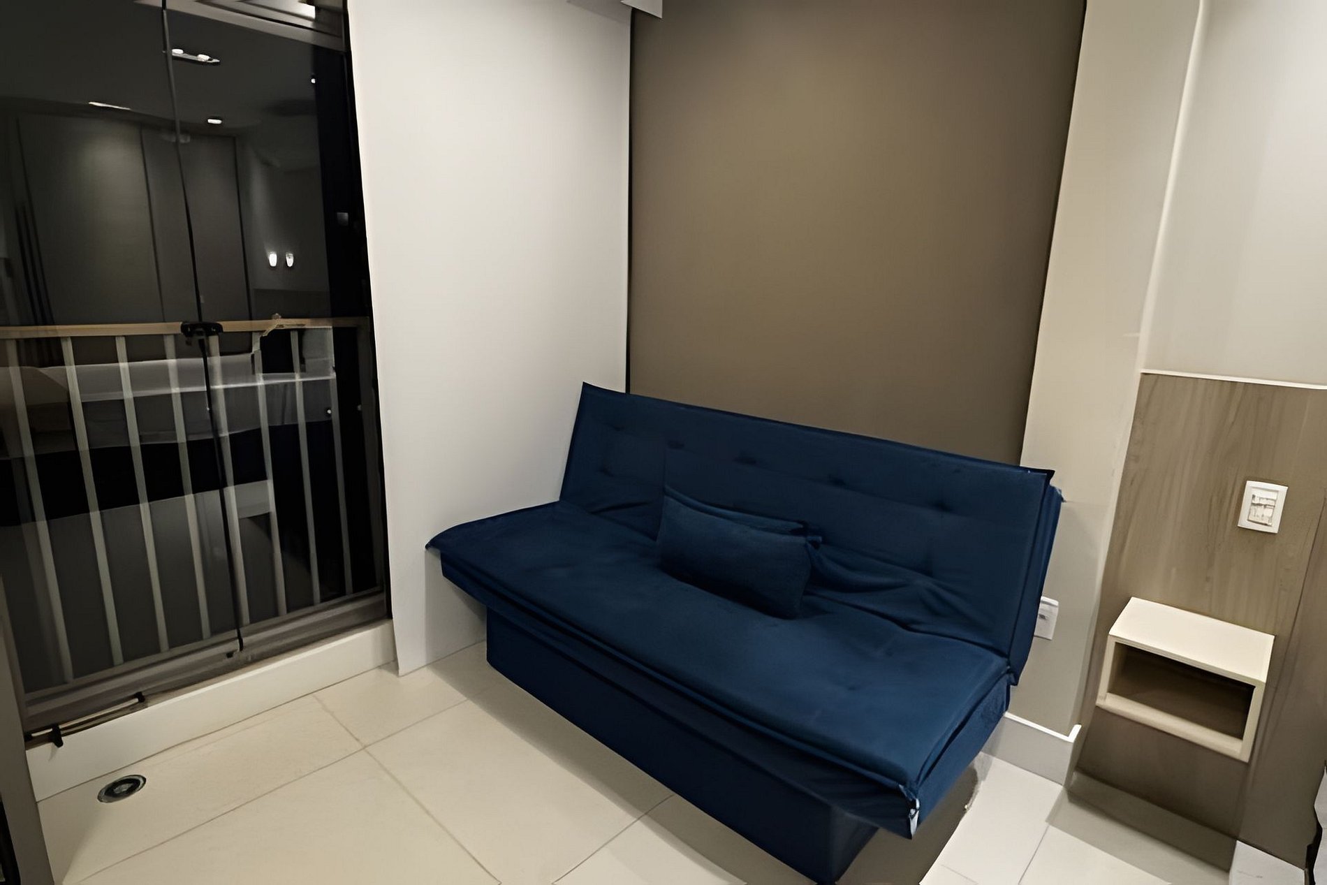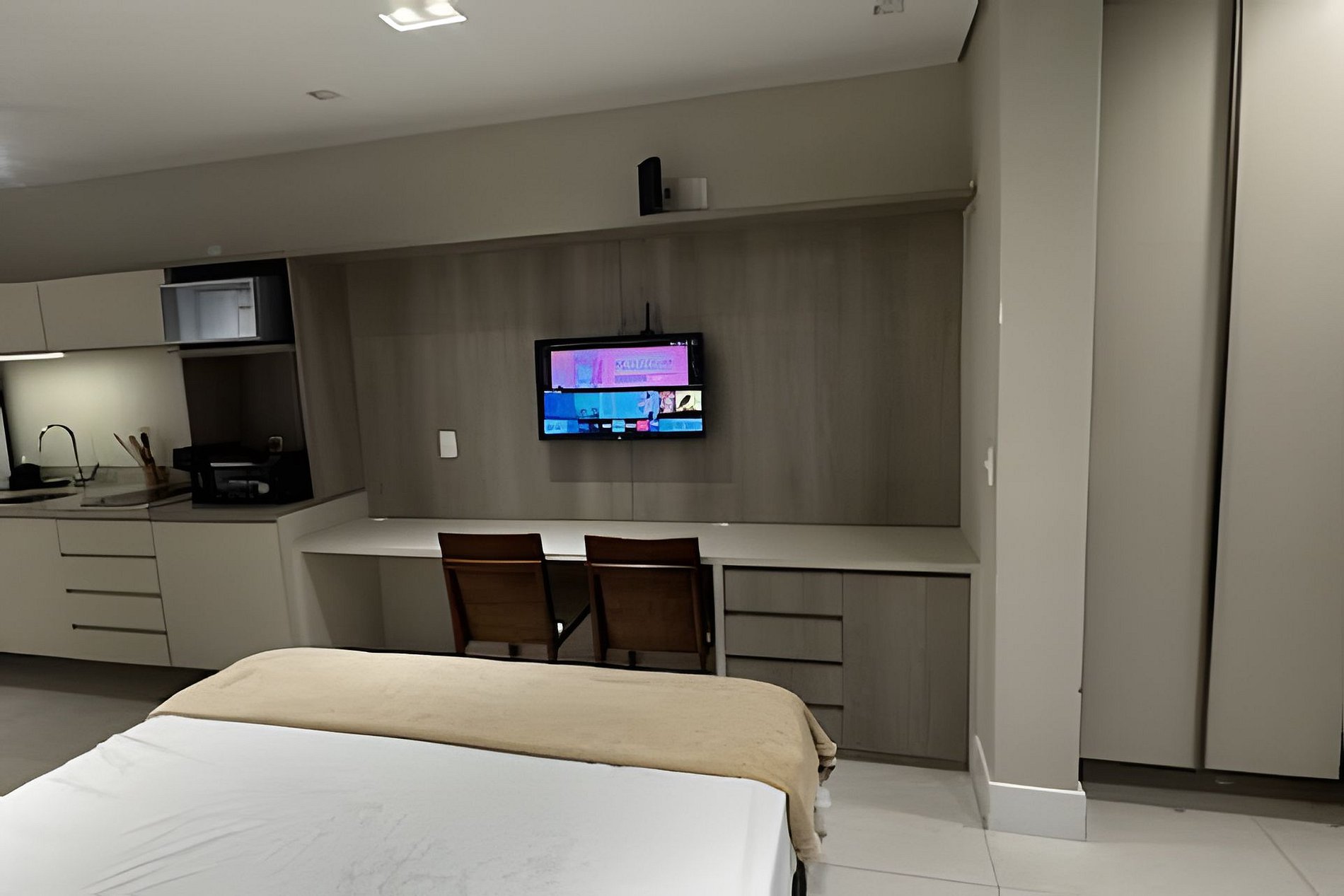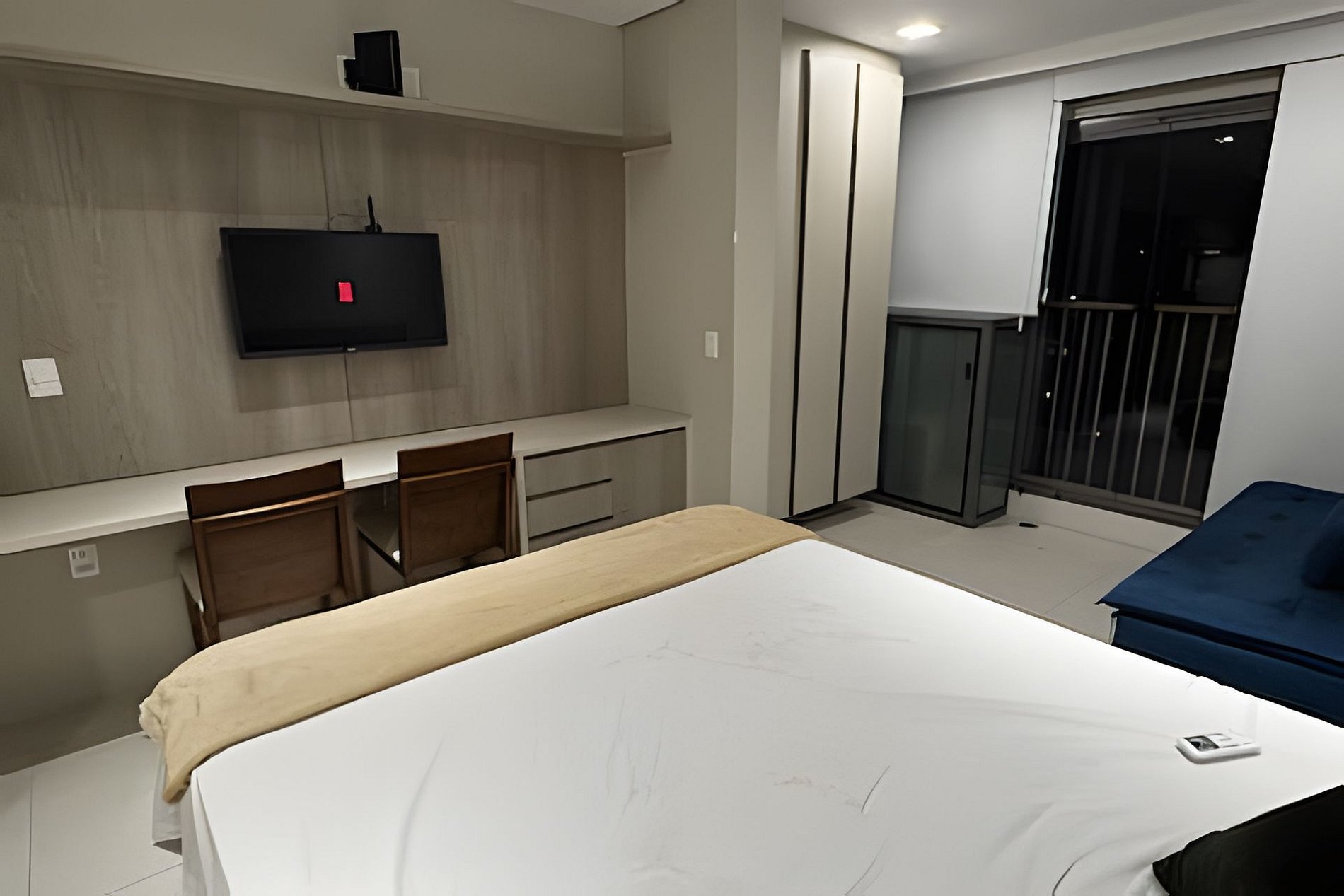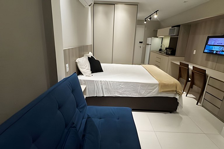 ᐅ Studio: cama queen size e sofá cama casal, roupas de cama, cortina blackout, Wifi 500Mbps, Tv Smart com canais de antena digital, ar condicionado split, fechadura eletrônica.