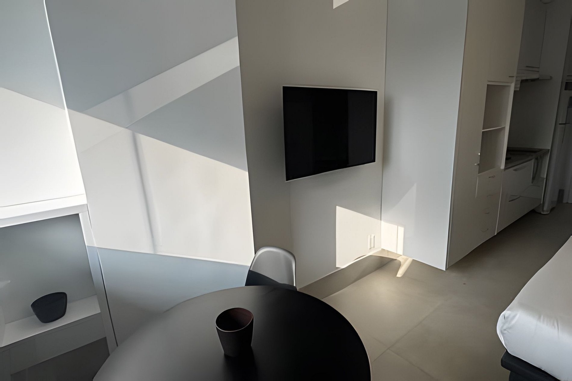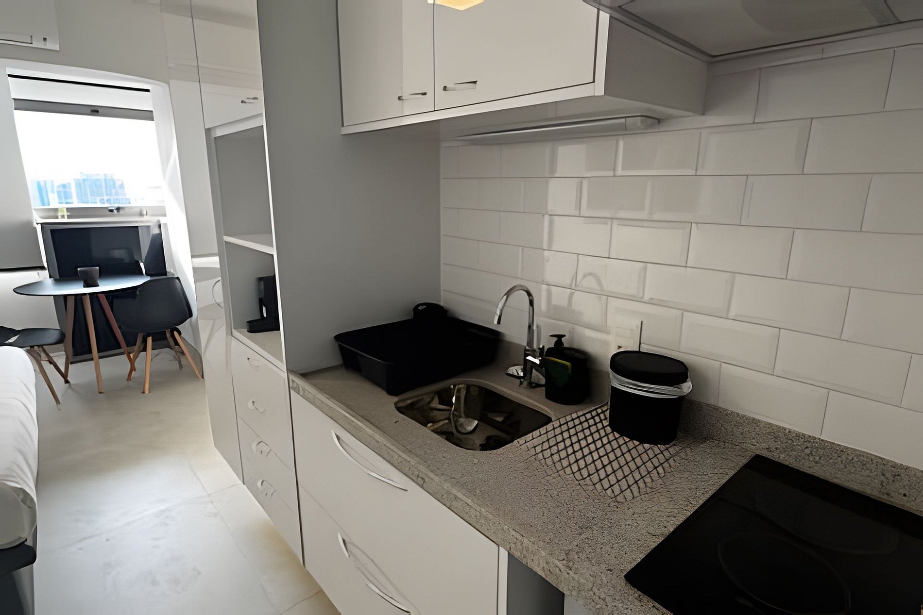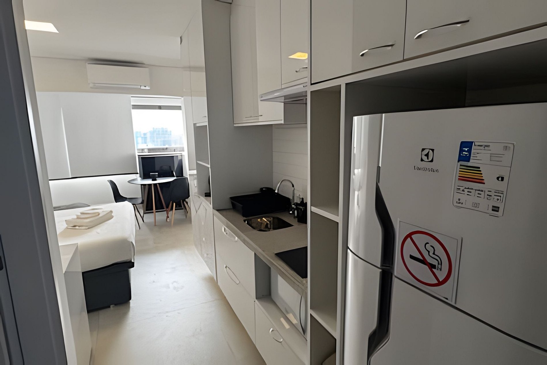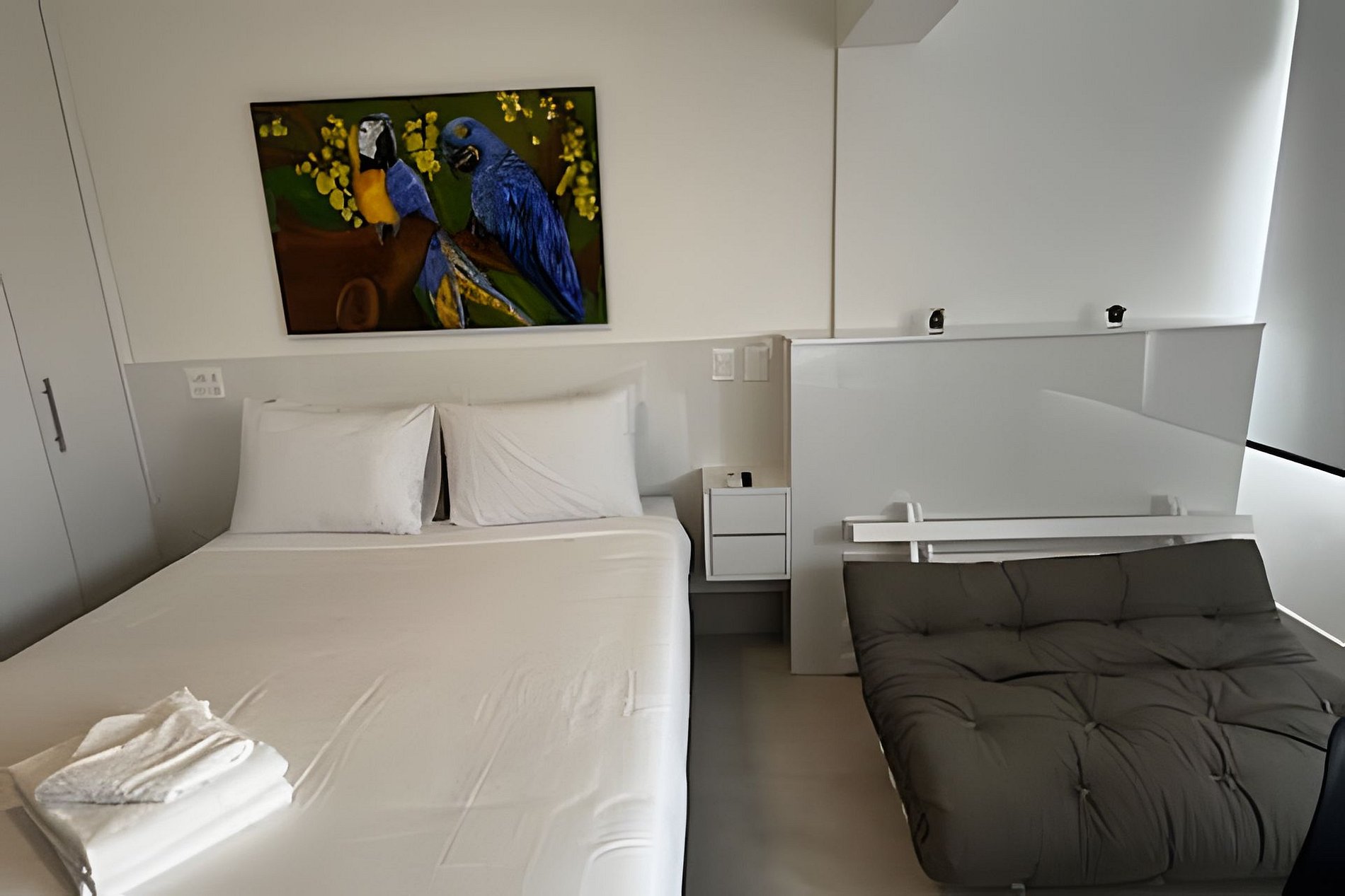 ▷ Studio: cama queen size, futon casal, enxoval padrão hotel, Wifi 500Mbps, Tv Smart, ar condicionado split, mesa para refeições e trabalho, ferro de passar ou vaporizador e fechadura eletrônica.