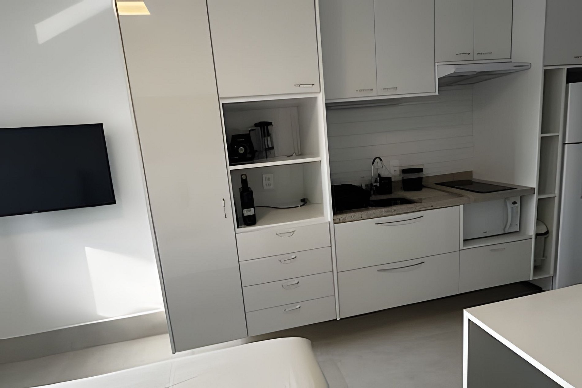 ▷ Cozinha integrada: totalmente equipada com cooktop, micro-ondas, geladeira, cafeteira Nespresso, liquidificador, copos, taças, pratos, talheres, panelas e utensílios de cozinha.