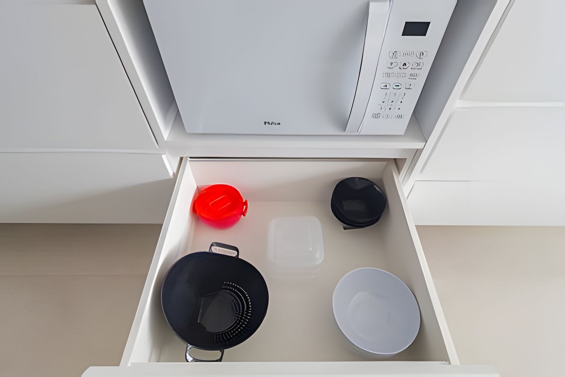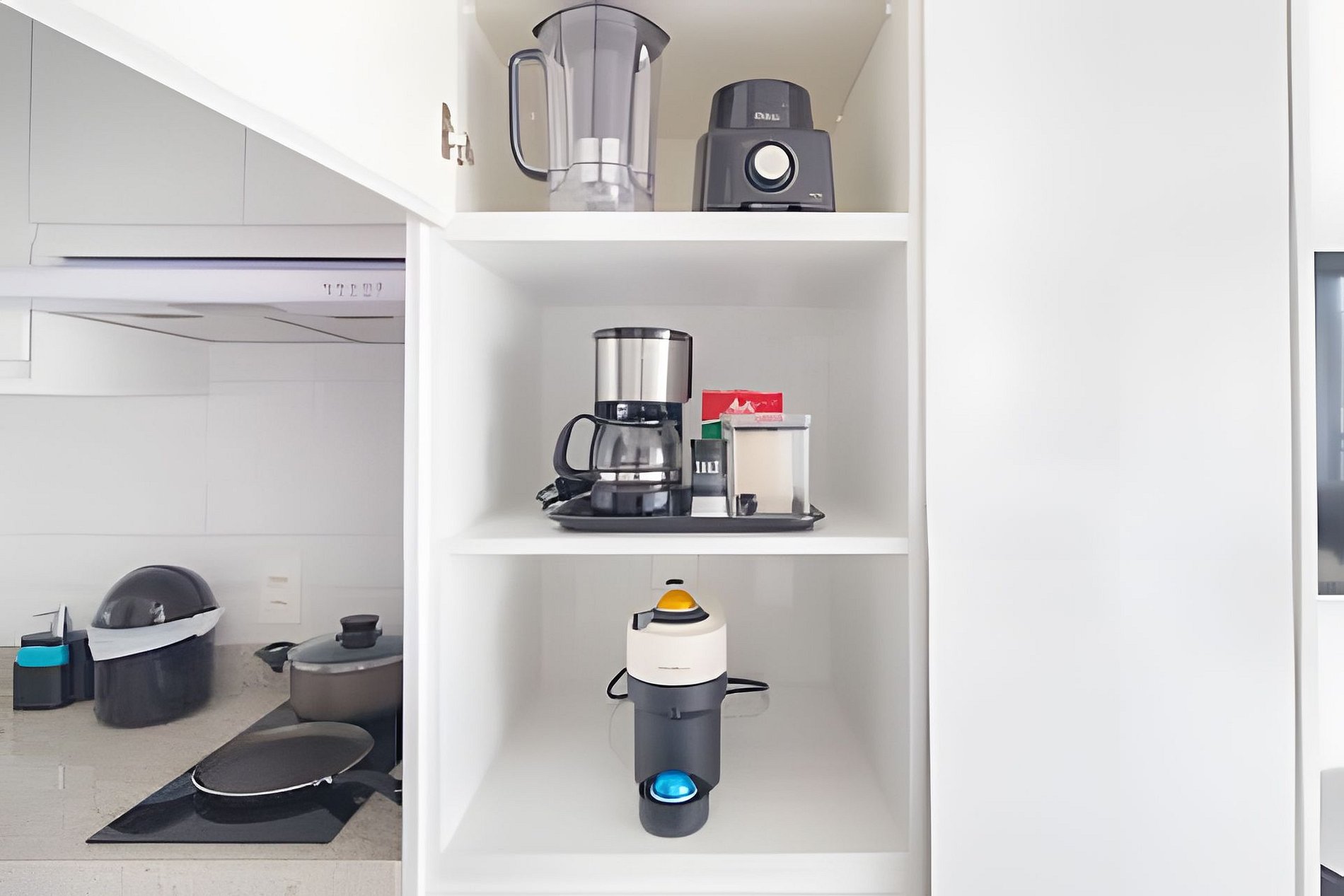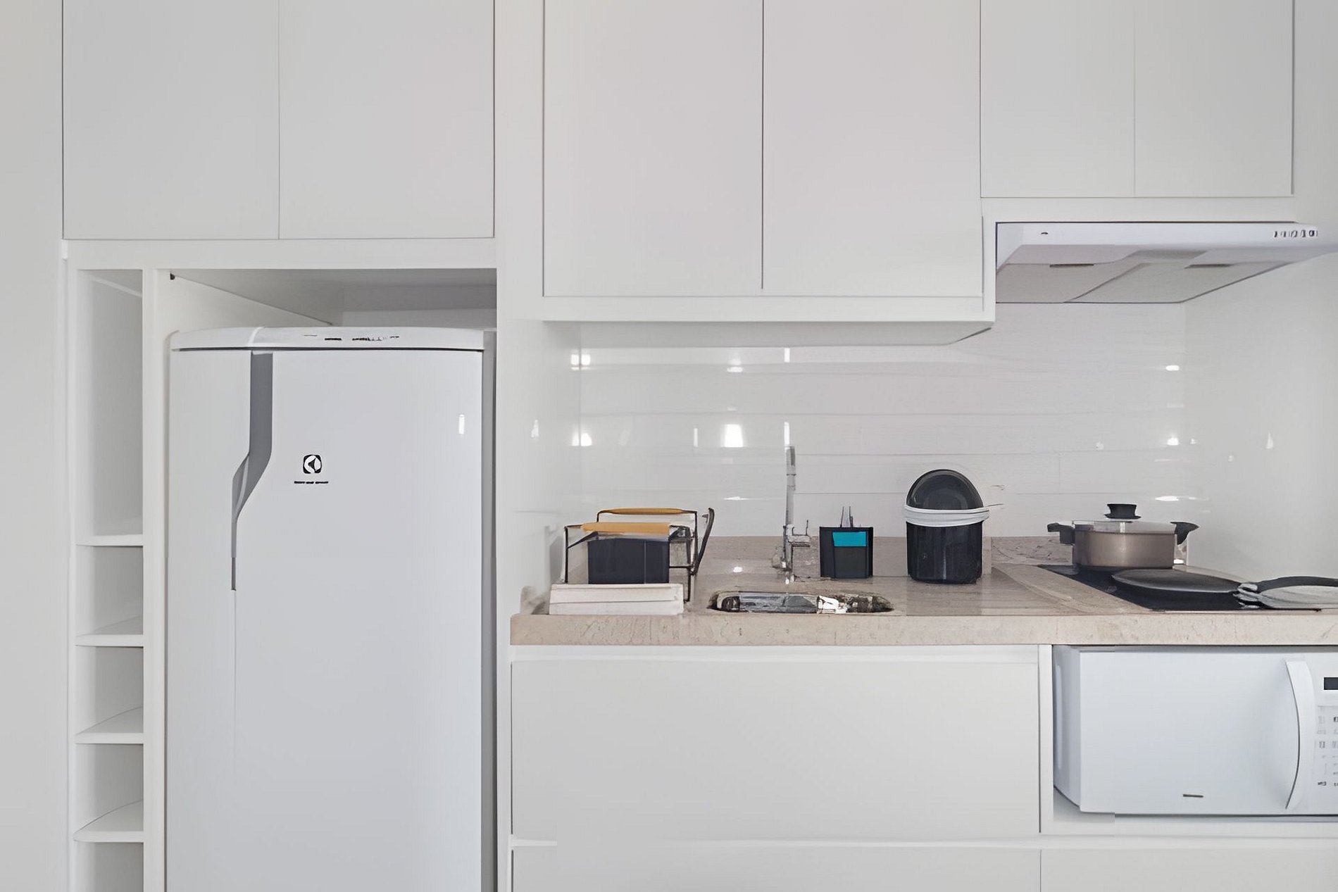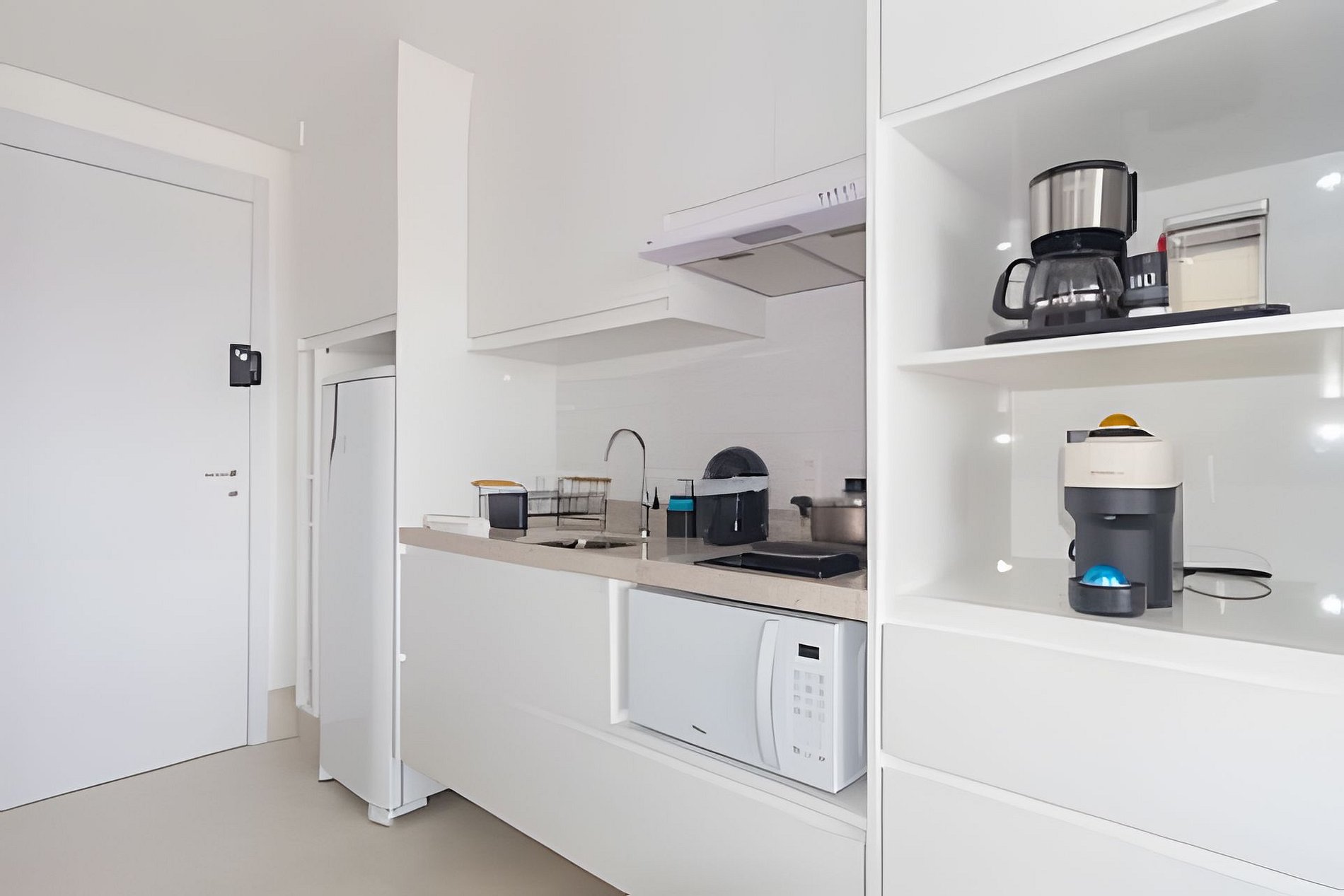 ▷ Cozinha integrada: totalmente equipada com cooktop, micro-ondas, geladeira, cafeteira Nespresso, liquidificador, copos, taças, pratos, talheres, panelas e utensílios de cozinha.