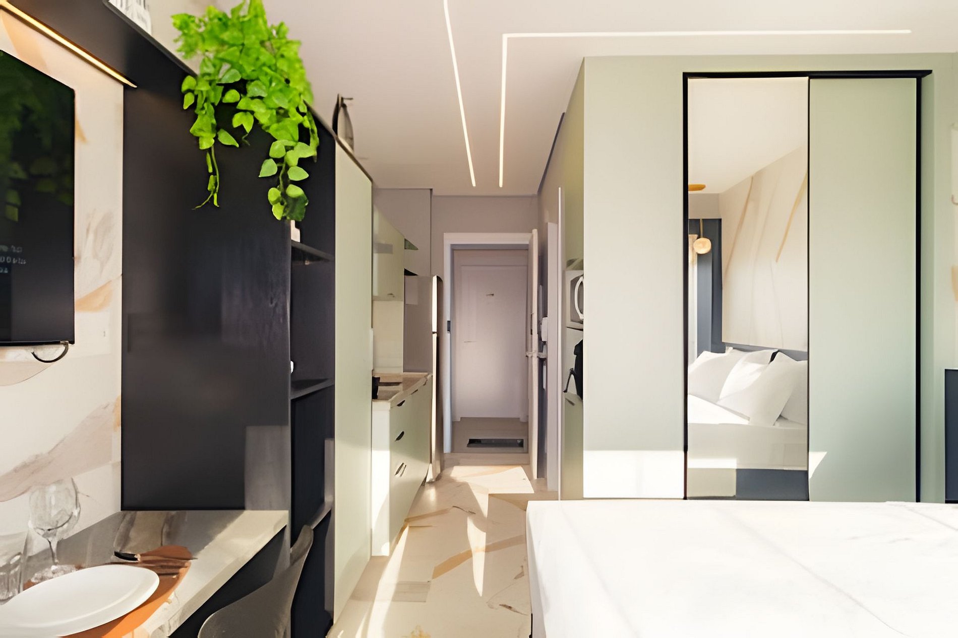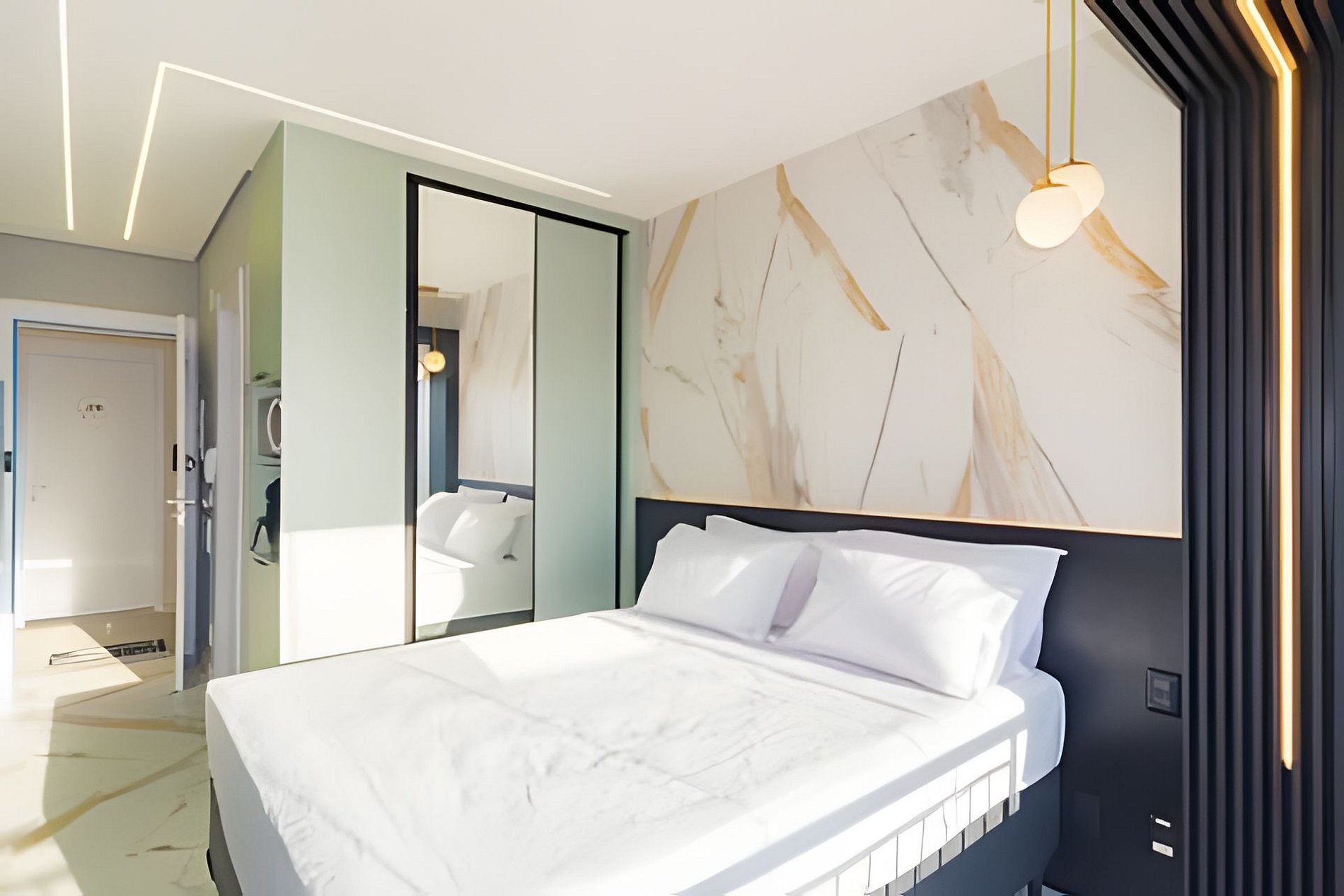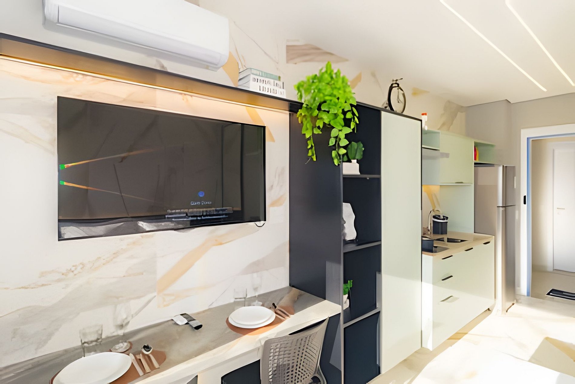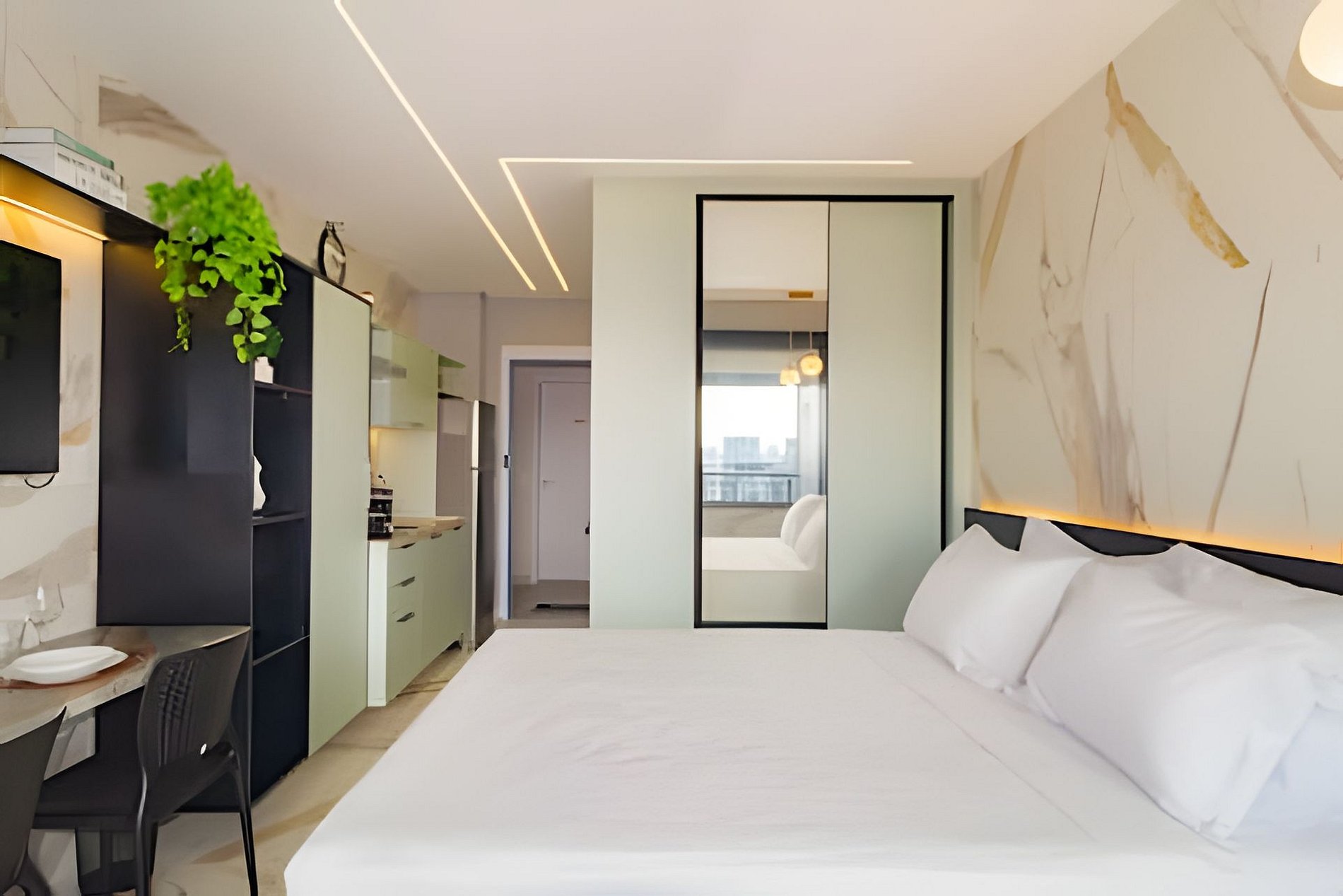 ▷ Studio: cama queen size, enxoval padrão hotel, Wifi 500Mbps, Tv Smart, ar condicionado split, mesa para refeições e trabalho, ferro de passar ou vaporizador e fechadura eletrônica.