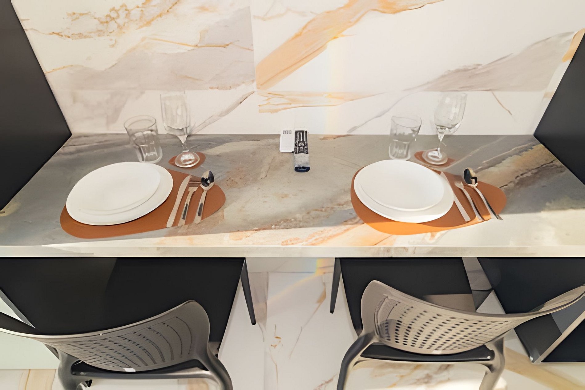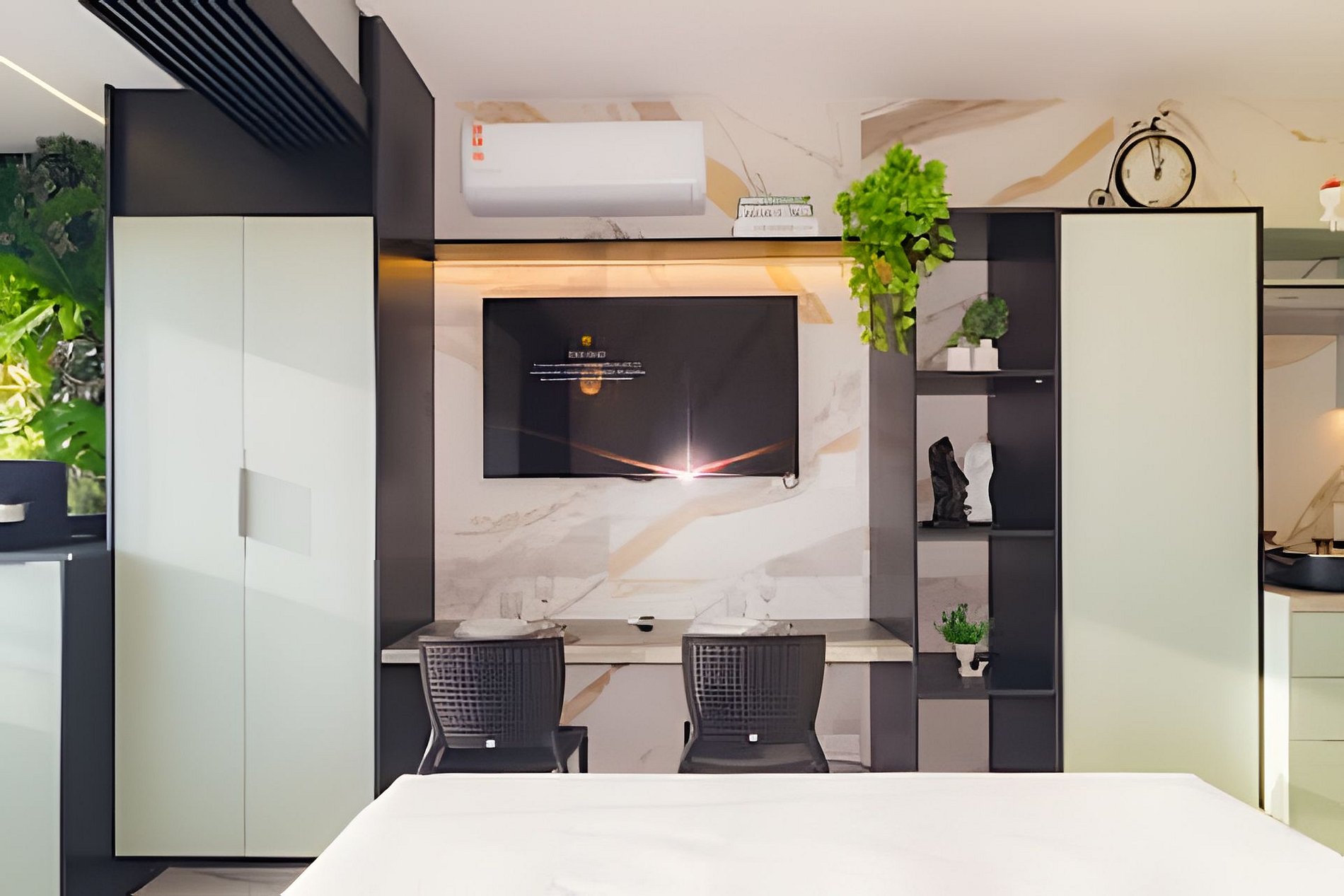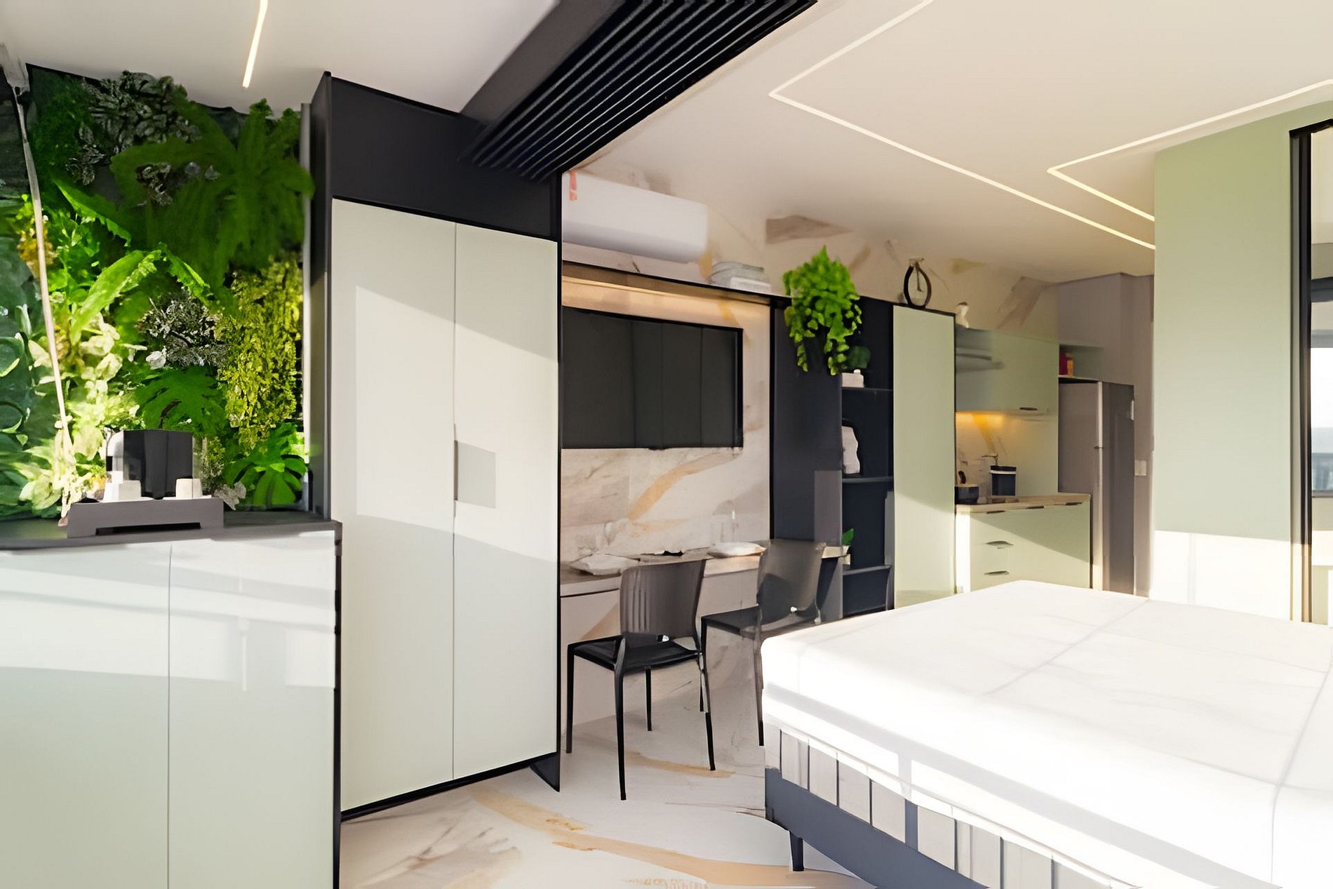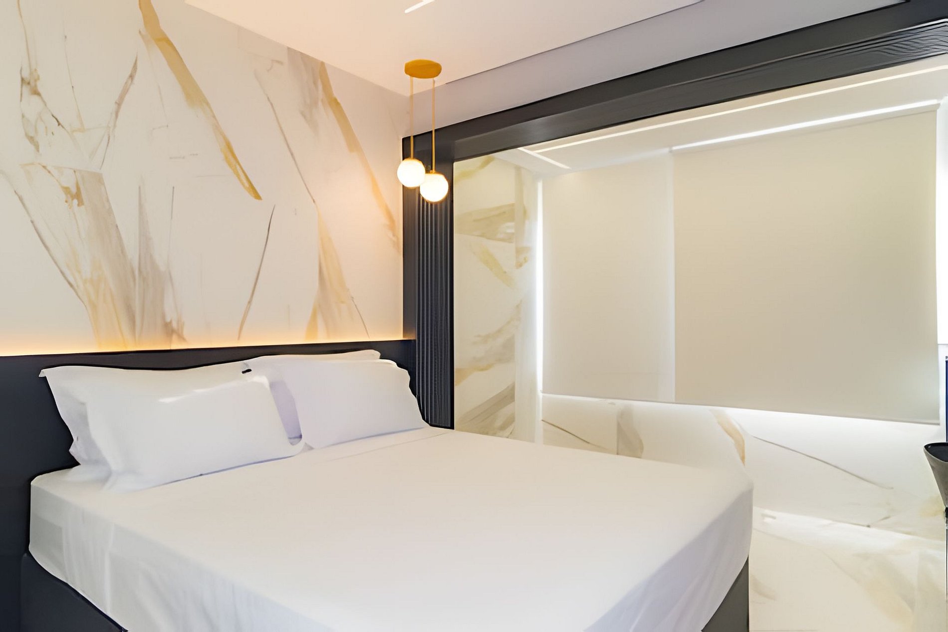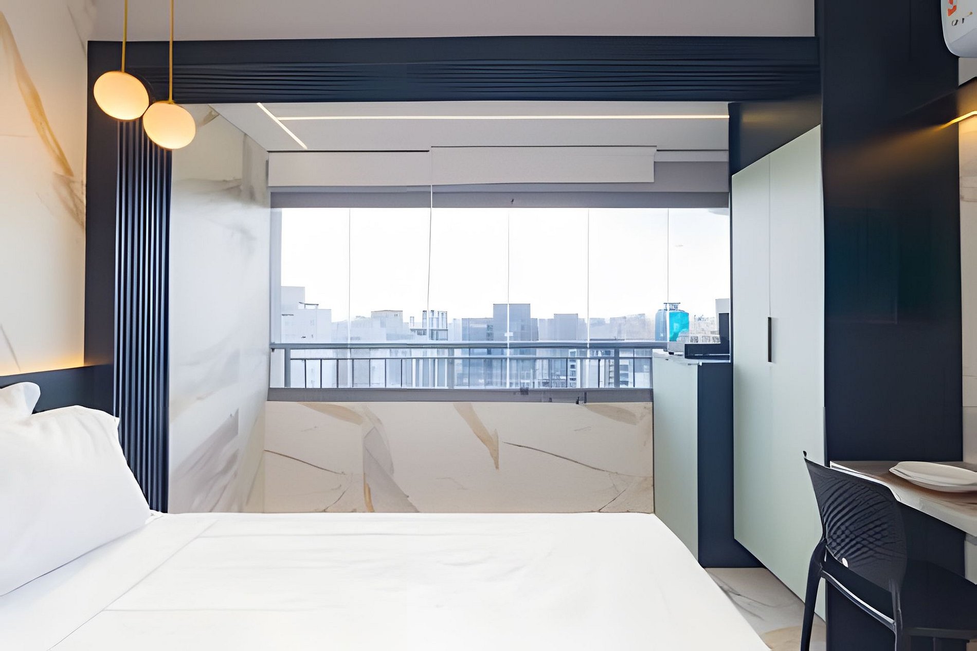 ▷ Studio: cama queen size, enxoval padrão hotel, Wifi 500Mbps, Tv Smart, ar condicionado split, mesa para refeições e trabalho, ferro de passar ou vaporizador e fechadura eletrônica.