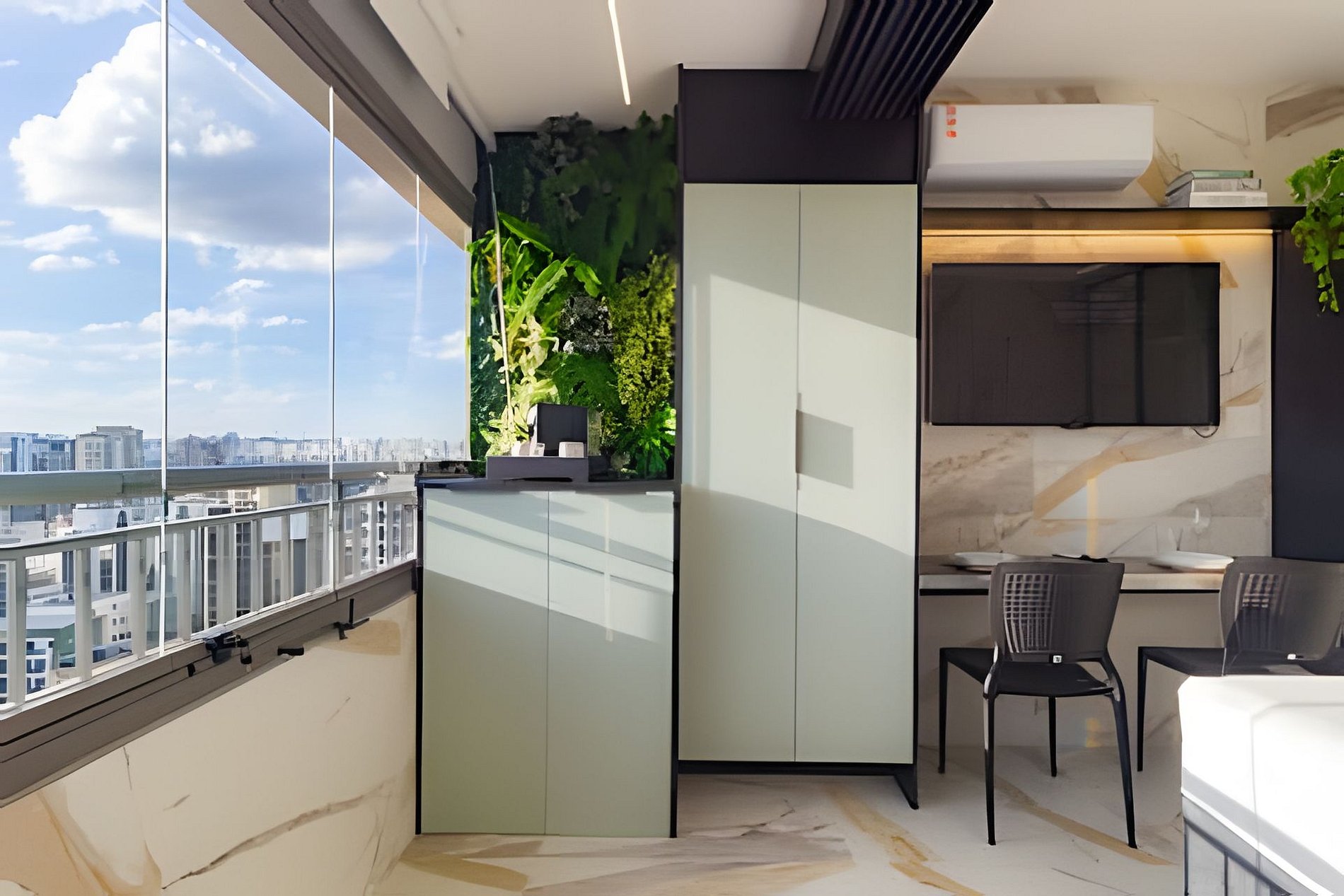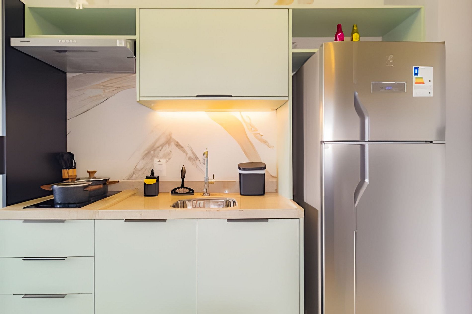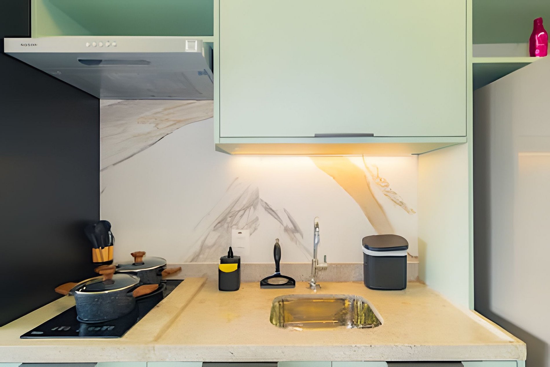▷ Cozinha integrada: totalmente equipada com cooktop, airfryer, micro-ondas, geladeira, cafeteira Nespresso, liquidificador, copos, taças, pratos, talheres, panelas e utensílios de cozinha.