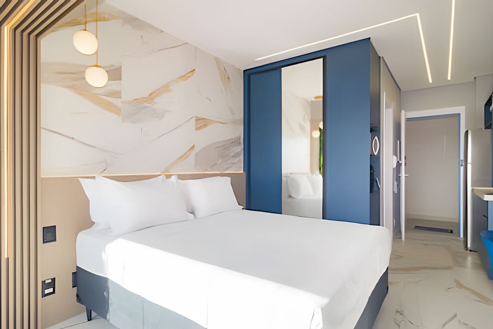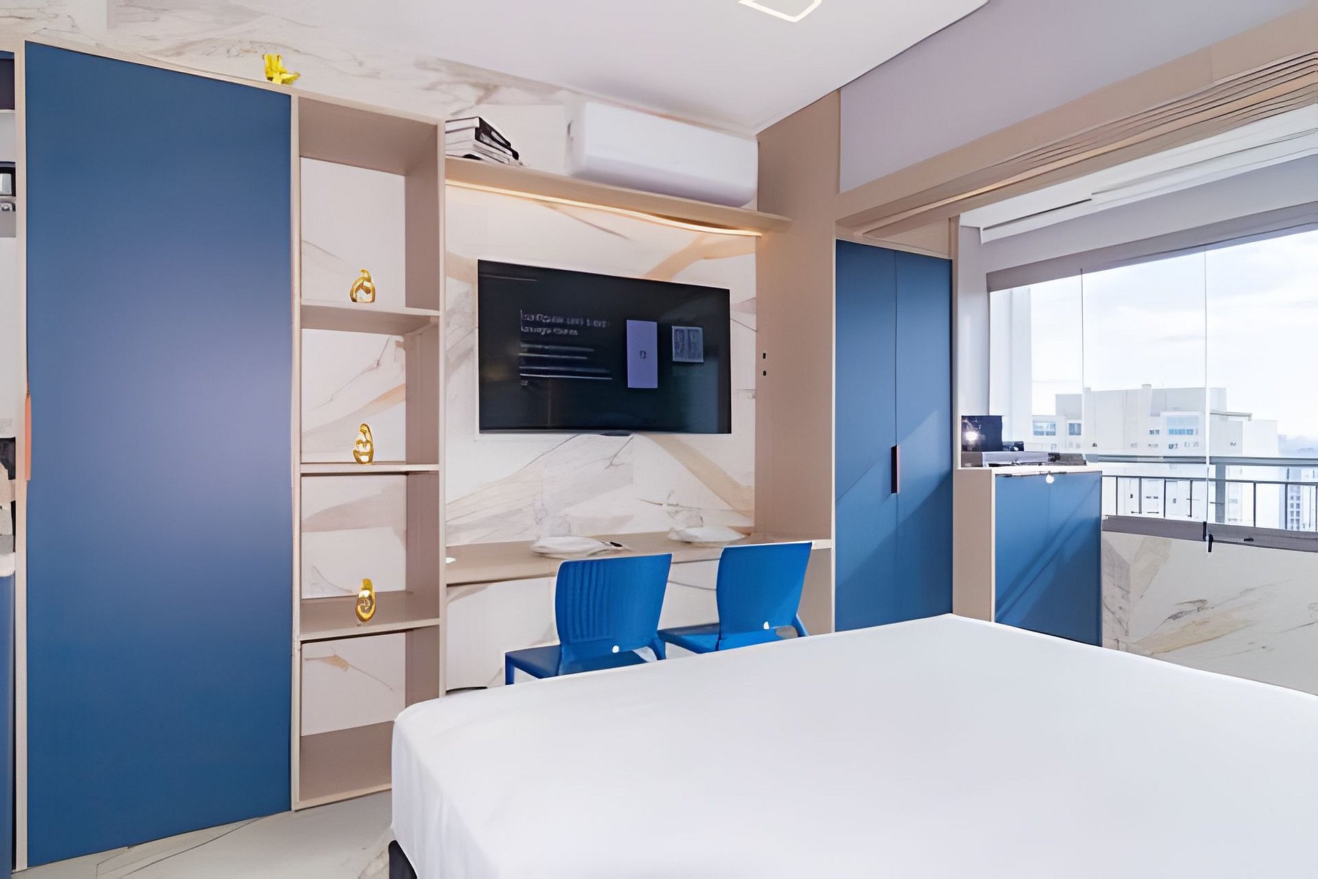 ▷ Studio: cama queen size, sofá cama casal, enxoval padrão hotel, Wifi 500Mbps, Tv Smart, ar condicionado split, mesa para refeições e trabalho, ferro de passar ou vaporizador e fechadura eletrônica.