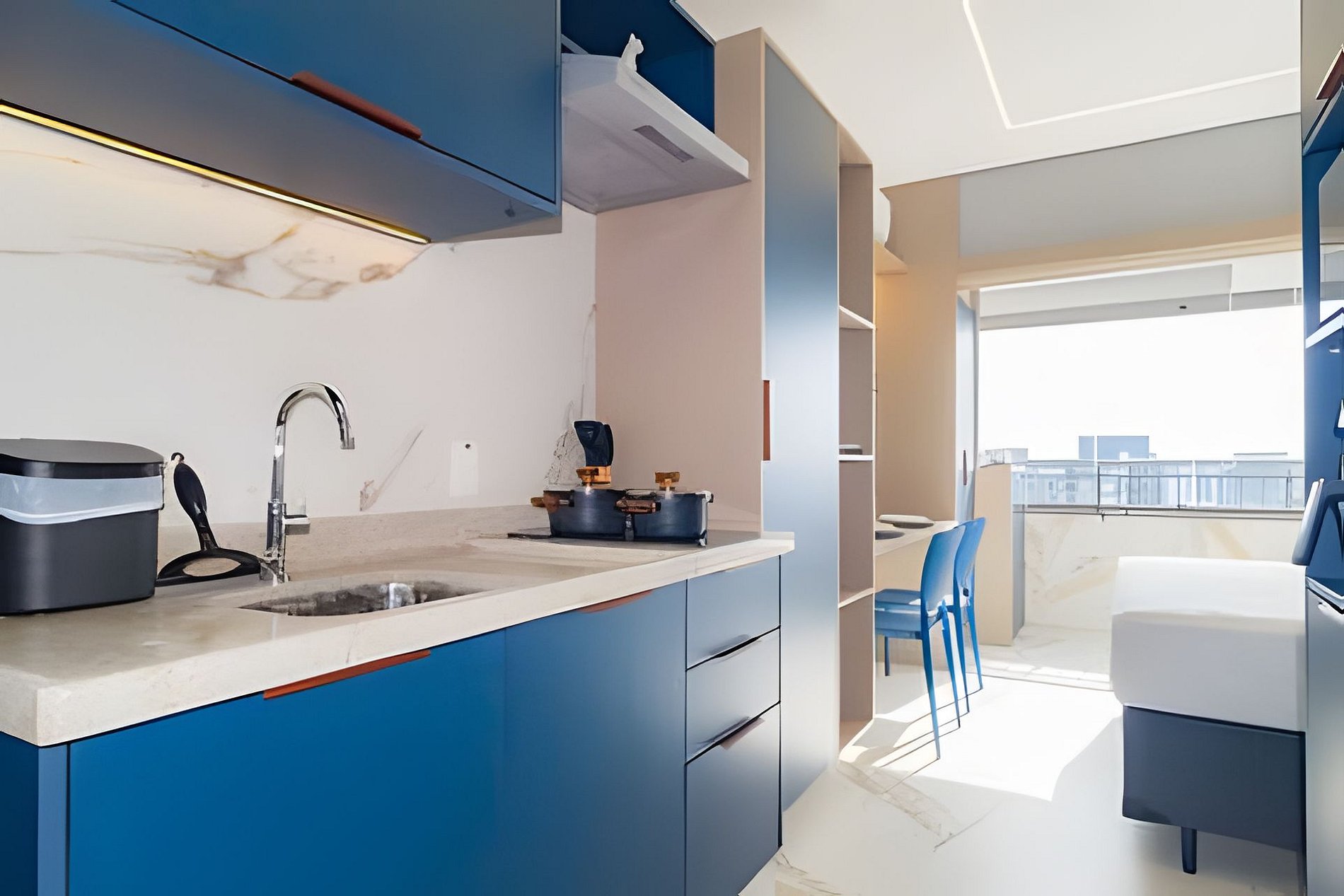 ▷ Cozinha integrada: totalmente equipada com cooktop, airfryer, micro-ondas, geladeira, cafeteira Nespresso, liquidificador, copos, taças, pratos, talheres, panelas e utensílios de cozinha.