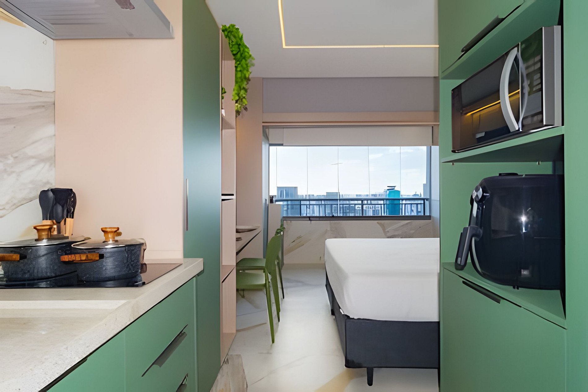 ▷ Cozinha integrada: totalmente equipada com cooktop, airfryer, micro-ondas, geladeira, cafeteira Nespresso, liquidificador, copos, taças, pratos, talheres, panelas e utensílios de cozinha.