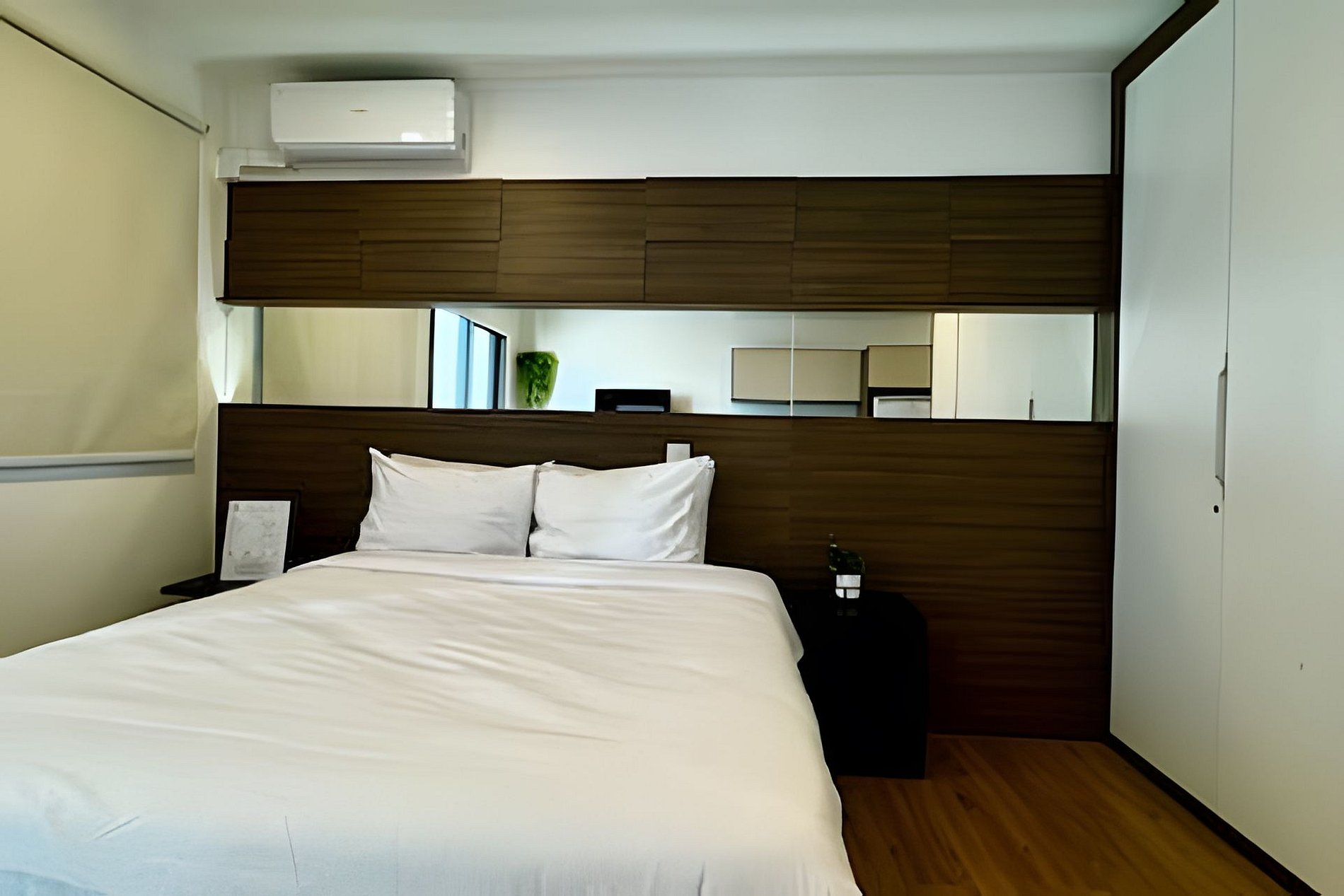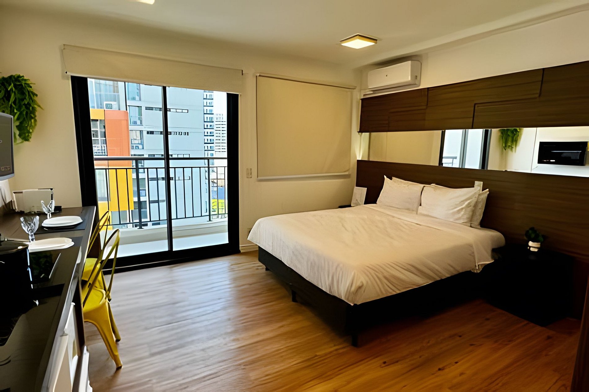ᐅ Studio: cama de queen size, sofá cama solteiro, roupas de cama, cortina blackout, Wifi 500Mbps, Tv Smart com canais de antena digital e todos os aplicativos de streaming, ar condicionado split, fechadura eletrônica.
