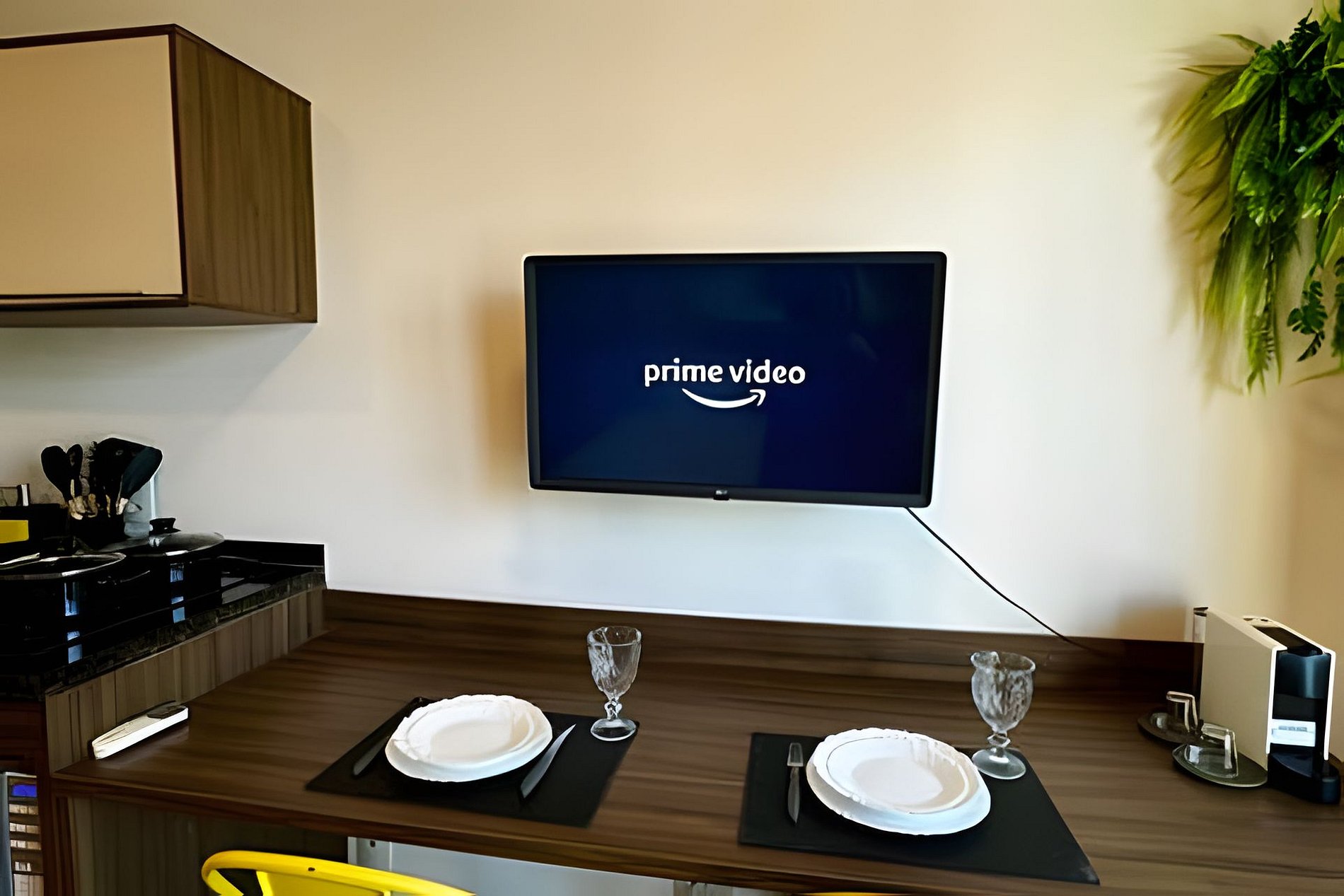 ᐅ Cozinha integrada: totalmente equipada com fogão, micro-ondas, geladeira, cafeteira Nespresso, copos, taças, pratos, talheres, panelas e utensílios de cozinha.